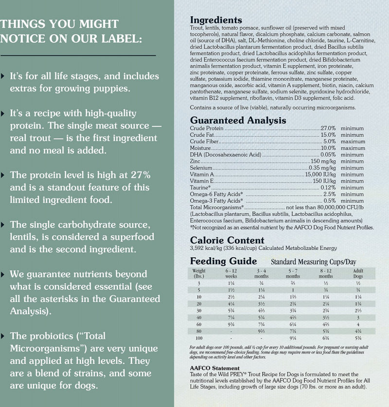 Shop / Dog Food / Taste Of The Wild Grain Free Prey Limited Ingredient Trout Dry Dog Food Taste Of The Wild Grain Free Prey Limited Ingredient Trout Dry Dog Food Taste Of The Wild $29.99 8 lb 25 lb 8-lb 25-lb Purchase Options Free In-Store Pick Up Not Available Save 10% on orders $49+ Set your store for inventory and store pickup details Zip Code Search Same-day Delivery* No minimum charge for delivery orders. *Order before 2pm and have it delivered today. Orders placed after 2pm will be delivered the next day. Must be inside delivery radius. Zip Code Unfortunately delivery is not available to this address. In order to ensure the best availability accuracy, changing your selected store will remove all items from your cart. You will need to re-add these items with your newly selected store if you choose to continue. Continue Cancel Ship it to Me Quantity Add To Cart Feeding guide disclaimer ✕ Feeding guides provide a starting point for the amount of food to give your pet each day. We recommend that you keep your pet in ideal body condition and not allow them to become overweight. The amount of food your pet needs can vary based on age, activity level or other food and treats given, so be sure to work with your veterinarian to determine an appropriate weight for your pet, and to make any necessary adjustments to their feeding. Information We believe everyone deserves to experience the benefits of simpler and cleaner eating. And that includes our pets. Limited ingredient diets may also be easier for some dogs to digest. In this simplified, limited ingredient recipe, real trout raised in spring-fed waters is the first of just four key ingredients. Along with chicken fat, trout also provides omega fatty acids that help maintain skin and coat health. Species-specific probiotics further support digestion, while guaranteed levels of antioxidants and DHA help support overall well-being. Finally, carefully selected vitamins and minerals ensure your dog is getting the balanced nutrition they require with the unique taste of trout they’ll crave. Ingredients Trout, lentils, tomato pomace, chicken fat (preserved with mixed tocopherols), natural flavor, dicalcium phosphate, calcium carbonate, salmon oil (source of DHA), salt, DL-Methionine, choline chloride, taurine, L-Carnitine, dried Lactobacillus plantarum fermentation product, dried Bacillus subtilis fermentation product, dried Lactobacillus acidophilus fermentation product, dried Enterococcus faecium fermentation product, dried Bifidobacterium animalis fermentation product, vitamin E supplement, iron proteinate, zinc proteinate, copper proteinate, ferrous sulfate, zinc sulfate, manganese sulfate, copper sulfate, potassium iodide, thiamine mononitrate, manganese proteinate, ascorbic acid, vitamin A supplement, biotin, niacin, calcium pantothenate, sodium selenite, pyridoxine hydrochloride, vitamin B12 supplement, riboflavin, vitamin D3 supplement, folic acid. Contains a source of live (viable), naturally occurring microorganisms. Guaranteed Analysis Nutrient Guaranteed Units Crude Protein 27% min Crude Fat 15% min Crude Fiber 5% max Moisture 10% max DHA 0.05% min Zinc 150 mg/kg min Selenium 0.35 mg/kg min Vitamin A 10,000 IU/kg min Vitamin E 150 IU/kg min Taurine 0.12% min Omega-6 Fatty Acids 2.5% min Omega-3 Fatty Acids 0.5% min L-Carnitine 500 mg/kg min Total Microorganisms 80,000,000 CFU/lb Customers also liked Customer Reviews