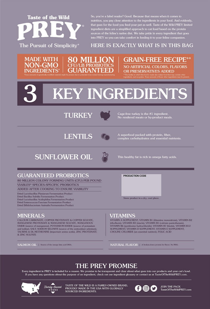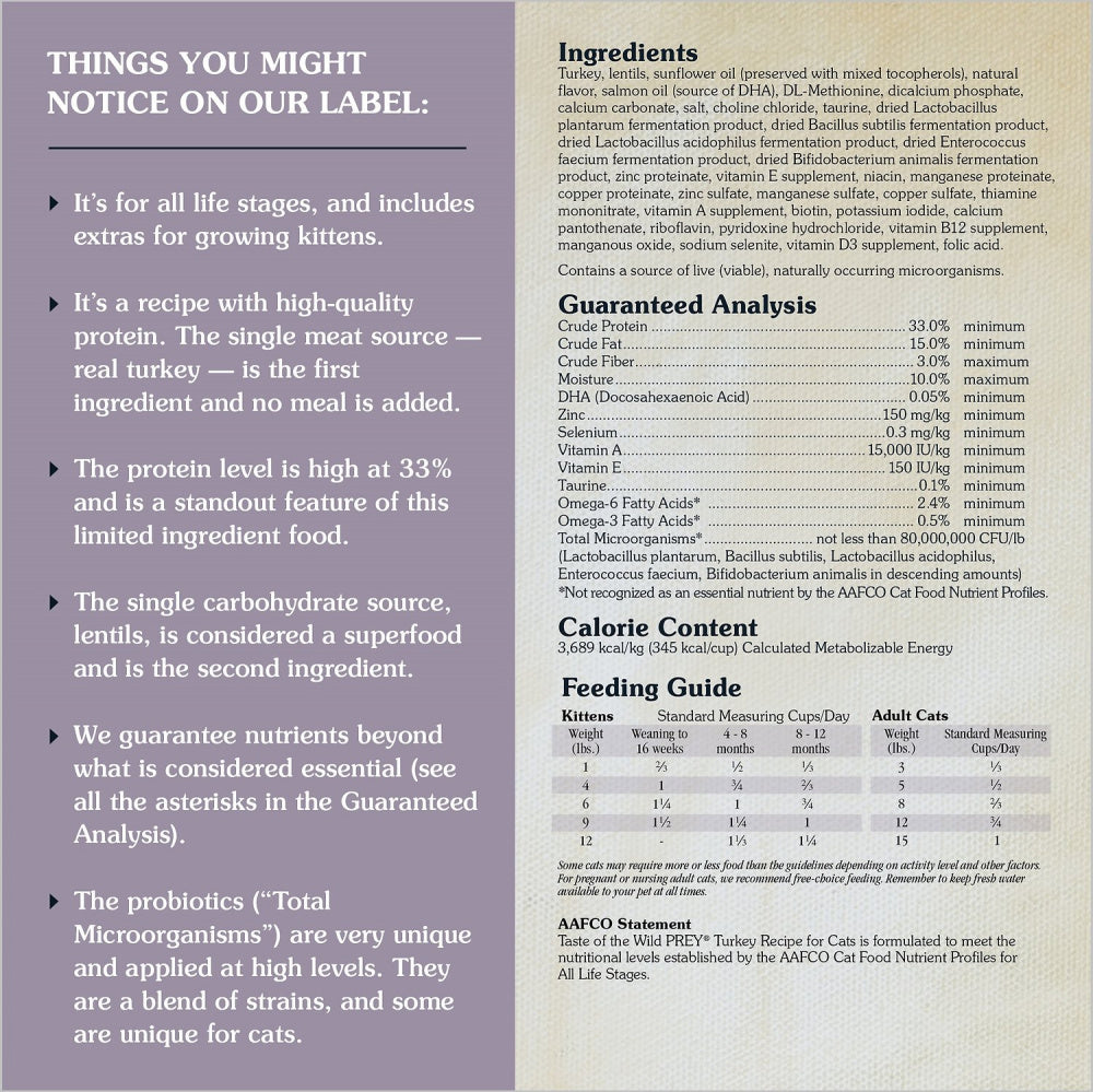Shop / Cat Food / Taste Of The Wild Grain Free Prey Limited Ingredient Turkey Dry Cat Food Taste Of The Wild Grain Free Prey Limited Ingredient Turkey Dry Cat Food Taste Of The Wild Weight: 6 lb $25.99 6-lb Purchase Options Free In-Store Pick Up Not Available Save 10% on orders $49+ Set your store for inventory and store pickup details Zip Code Search Same-day Delivery* No minimum charge for delivery orders. *Order before 2pm and have it delivered today. Orders placed after 2pm will be delivered the next day. Must be inside delivery radius. Zip Code Unfortunately delivery is not available to this address. In order to ensure the best availability accuracy, changing your selected store will remove all items from your cart. You will need to re-add these items with your newly selected store if you choose to continue. Continue Cancel Ship it to Me Quantity Add To Cart Feeding guide disclaimer ✕ Feeding guides provide a starting point for the amount of food to give your pet each day. We recommend that you keep your pet in ideal body condition and not allow them to become overweight. The amount of food your pet needs can vary based on age, activity level or other food and treats given, so be sure to work with your veterinarian to determine an appropriate weight for your pet, and to make any necessary adjustments to their feeding. Information The fowl your cat’s ancestors hunted didn’t live in a cage, so neither do ours. Cage-free turkey is the main ingredient in this simple but satisfying limited ingredient diet. 98% of protein comes from just two ingredients: 60% from turkey and 38% from lentils. Chicken fat and carefully selected vitamins and minerals round out this complete diet, while guaranteed probiotics help support digestion. With PREY limited ingredient diets, you can give your cat the complete nutrition they need and a taste they crave — without the hunt. Ingredients Turkey, lentils, chicken fat (preserved with mixed tocopherols), natural flavor, salmon oil (source of DHA), DL-Methionine, dicalcium phosphate, calcium carbonate, salt, choline chloride, taurine, dried Lactobacillus plantarum fermentation product, dried Bacillus subtilis fermentation product, dried Lactobacillus acidophilus fermentation product, dried Enterococcus faecium fermentation product, dried Bifidobacterium animalis fermentation product, zinc proteinate, vitamin E supplement, niacin, manganese proteinate, copper proteinate, zinc sulfate, manganese sulfate, copper sulfate, thiamine mononitrate, vitamin A supplement, biotin, potassium iodide, calcium pantothenate, riboflavin, pyridoxine hydrochloride, vitamin B12 supplement, sodium selenite, vitamin D3 supplement, folic acid. Contains a source of live (viable), naturally occurring microorganisms. Guaranteed Analysis Nutrient Guaranteed Units Crude Protein 33% min Crude Fat 15% min Crude Fiber 3% max Moisture 10% max DHA 0.05% min Zinc 150 mg/kg min Selenium 0.3 mg/kg min Vitamin A 10,000 IU/kg min Vitamin E 150 IU/kg min Taurine 0.1% min Omega-6 Fatty Acids 2.4% min Omega-3 Fatty Acids 0.5% min Total Microorganisms 80,000,000 CFU/lb Customers also liked Customer Reviews