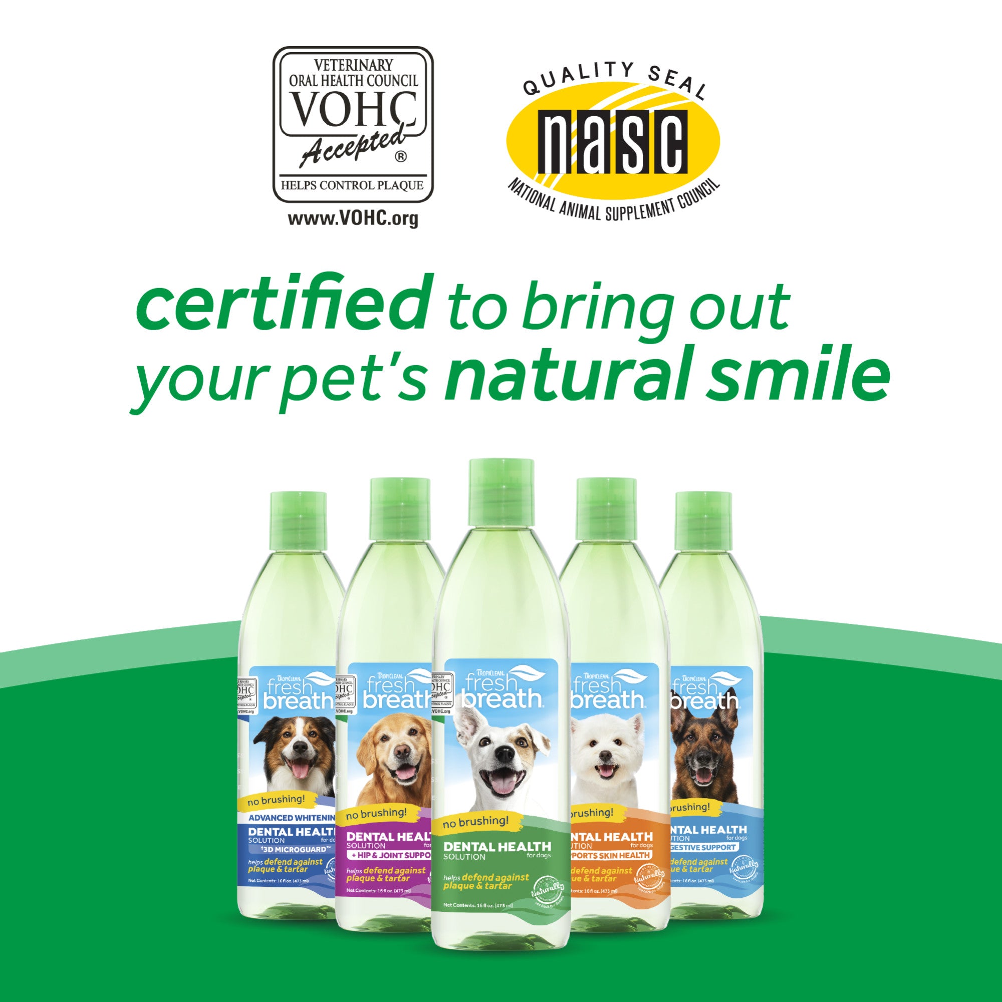 Shop / Unknown Type / TropiClean Fresh Breath Advanced Whitening Dental Health Solution for Dogs, 16oz TropiClean Fresh Breath Advanced Whitening Dental Health Solution for Dogs, 16oz TropiClean Default Title $17.99 Default Title Purchase Options Free In-Store Pick Up Not Available Save 10% on orders $49+ Set your store for inventory and store pickup details Zip Code Search Same-day Delivery* No minimum charge for delivery orders. *Order before 2pm and have it delivered today. Orders placed after 2pm will be delivered the next day. Must be inside delivery radius. Zip Code Unfortunately delivery is not available to this address. In order to ensure the best availability accuracy, changing your selected store will remove all items from your cart. You will need to re-add these items with your newly selected store if you choose to continue. Continue Cancel Ship it to Me Quantity Add To Cart Information Cleaning your pet's teeth is about more than just getting their pearly whites to sparkle -- it's an important step in their overall health and wellness. With TropiClean Fresh Breath Advanced Whitening Dental Health Solution, dogs can benefit from daily plaque and tartar defense. This special formula contains powerful, safe ingredients formulated to help brighten teeth. Easy-to-use Dental Health Solution gives your dog clean teeth and fresh breath-no brushing required! Customers also liked Customer Reviews