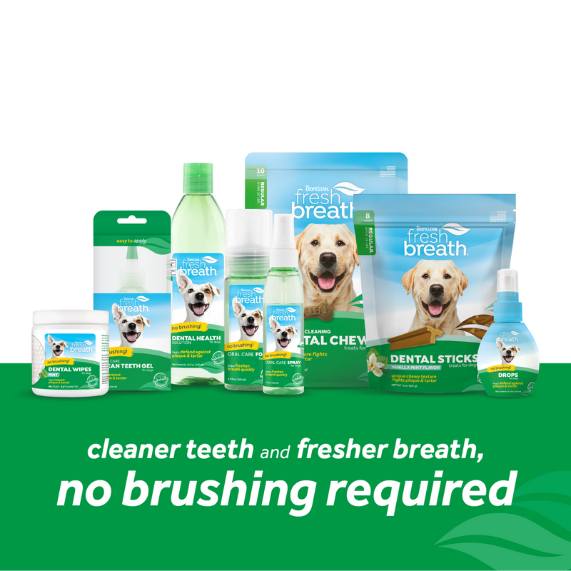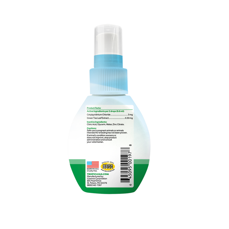 Shop / Pet Oral Care Supplies / TropiClean Fresh Breath Oral Care Drops for Dogs - Dog Breath Freshener TropiClean Fresh Breath Oral Care Drops for Dogs - Dog Breath Freshener TropiClean 2 oz. $15.99 2 oz. Purchase Options Free In-Store Pick Up Not Available Save 10% on orders $49+ Set your store for inventory and store pickup details Zip Code Search Same-day Delivery* No minimum charge for delivery orders. *Order before 2pm and have it delivered today. Orders placed after 2pm will be delivered the next day. Must be inside delivery radius. Zip Code Unfortunately delivery is not available to this address. In order to ensure the best availability accuracy, changing your selected store will remove all items from your cart. You will need to re-add these items with your newly selected store if you choose to continue. Continue Cancel Ship it to Me Quantity Add To Cart Information TropiClean Fresh Breath Drops keep your pets’ mouths healthy and their breath fresh. Developed with naturally derived ingredients, TropiClean Fresh Breath Drops help turn bad dog breath into fresh breath while providing essential daily oral care. Add just 2 drops to 8 ounces of water, twice a day, to give your dog fresh breath, a healthy mouth, and happy moments. Helps defend against plaque, leading to fresher breath. Customers also liked Customer Reviews