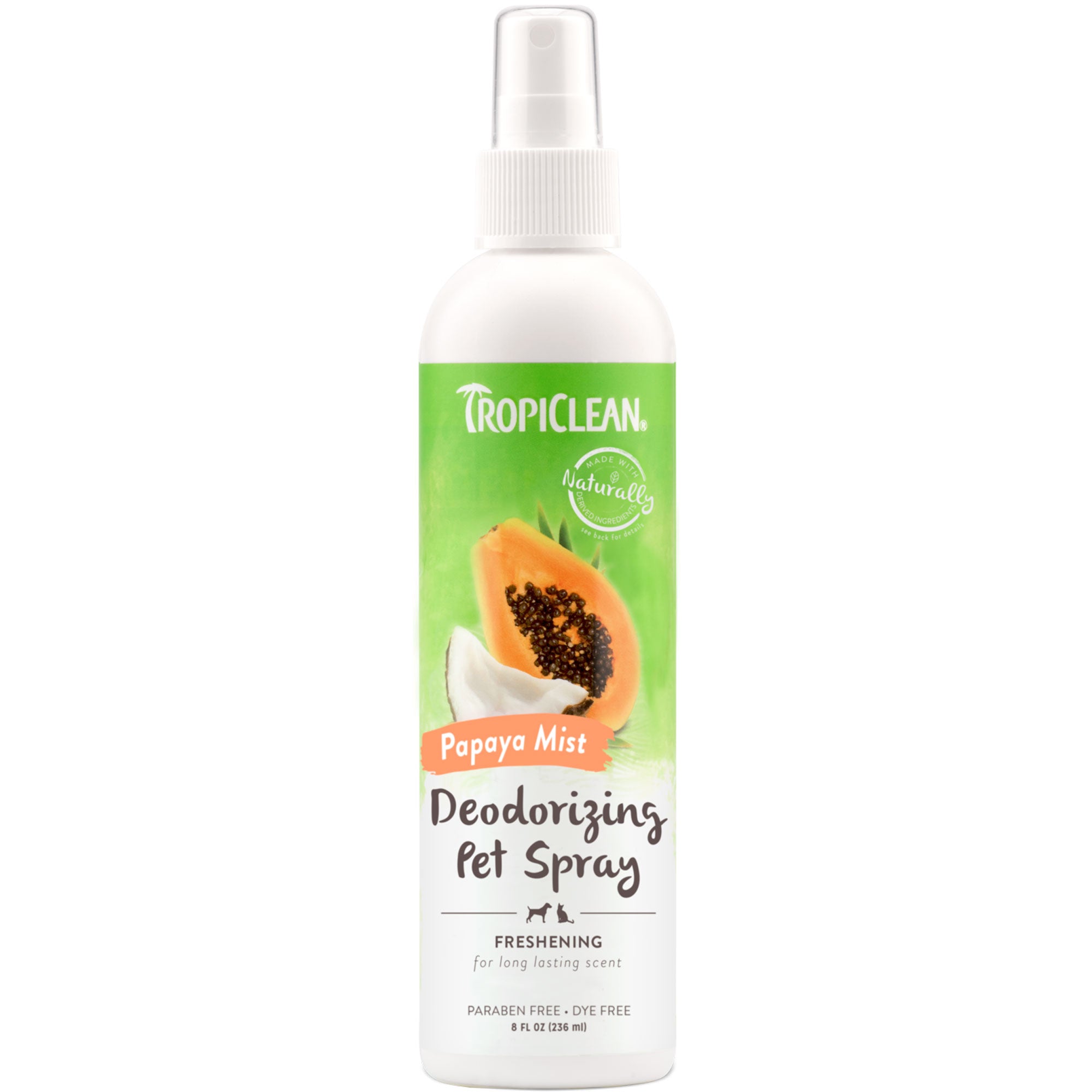 Shop / Unknown Type / TropiClean Papaya Mist Deodorizing Spray for Pets, 8oz TropiClean Papaya Mist Deodorizing Spray for Pets, 8oz TropiClean 8oz $12.99 8oz Purchase Options Free In-Store Pick Up Not Available Save 10% on orders $49+ Set your store for inventory and store pickup details Zip Code Search Same-day Delivery* No minimum charge for delivery orders. *Order before 2pm and have it delivered today. Orders placed after 2pm will be delivered the next day. Must be inside delivery radius. Zip Code Unfortunately delivery is not available to this address. In order to ensure the best availability accuracy, changing your selected store will remove all items from your cart. You will need to re-add these items with your newly selected store if you choose to continue. Continue Cancel Ship it to Me Quantity Add To Cart Information TropiClean Deodorizing Pet Spray conditions and soothes as it breaks down bad smells at their source, effectively refreshing your dog, cat, and home. The sweet and fruity scent of papaya leaves your pet smelling fresh and ready for cuddles! Ingredients: Water, Ethyl Alcohol, Hydrolyzed Wheat Protein, Colloidal Oatmeal, Coconut Water, Botanical Blend Of (Papaya Extract, Kiwi Extract, Mango Extract, Pomegranate Extract, Yucca Extract, Chamomile Extract, Aloe Extract), Emulsifier, Odor Neutralizer, Vitamin E, Fragrance, Preservative Customers also liked Customer Reviews