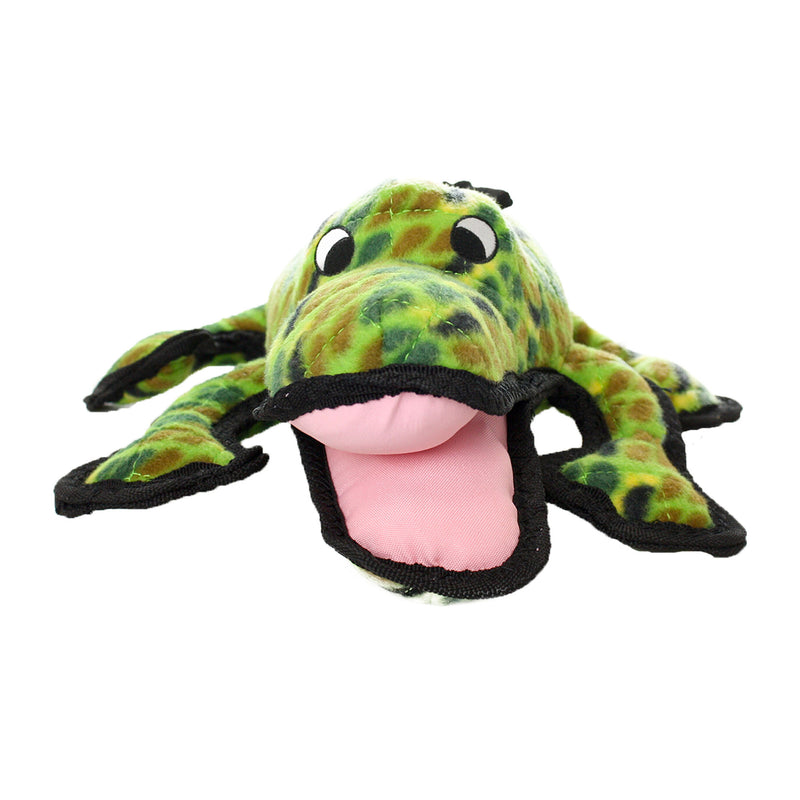 The Tuffy Ocean Creature Alligator is a great tug and fetch toy for dogs of all sizes. This toy is made with multiple layers of material that are bonded and sewn together to make one "Tuff" Layer. Each toy is then stuffed with safe, non-toxic fiber and sewn with multiple rows of stitching for extra strength and durability. Protective binding covers outside seams and makes the toy even stronger. The Tuffy Ocean Creature Alligator has one squeaker, sewn inside a protective pouch for your dog's safety, and to provide hours of fun and entertainment. Tuffy dog toys can also float and are best used as interactive play toys and not chew toys. Machine wash / Air dry.