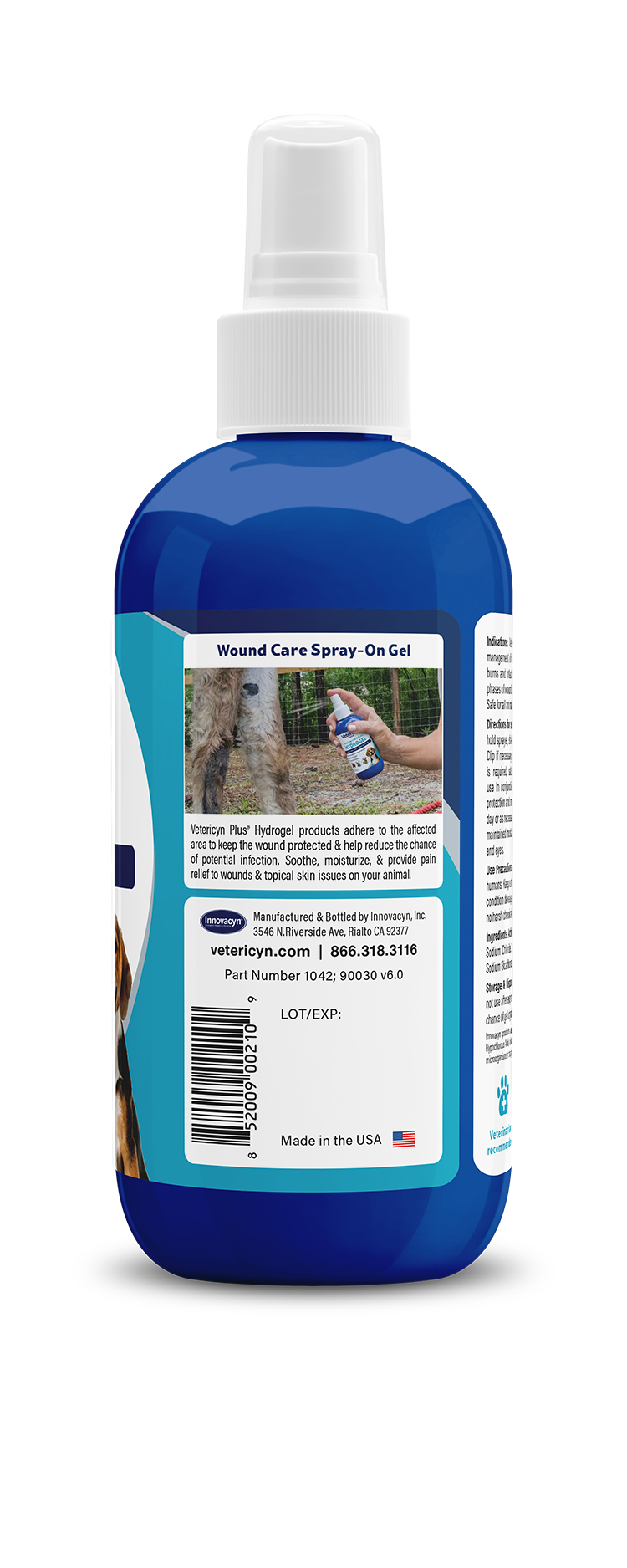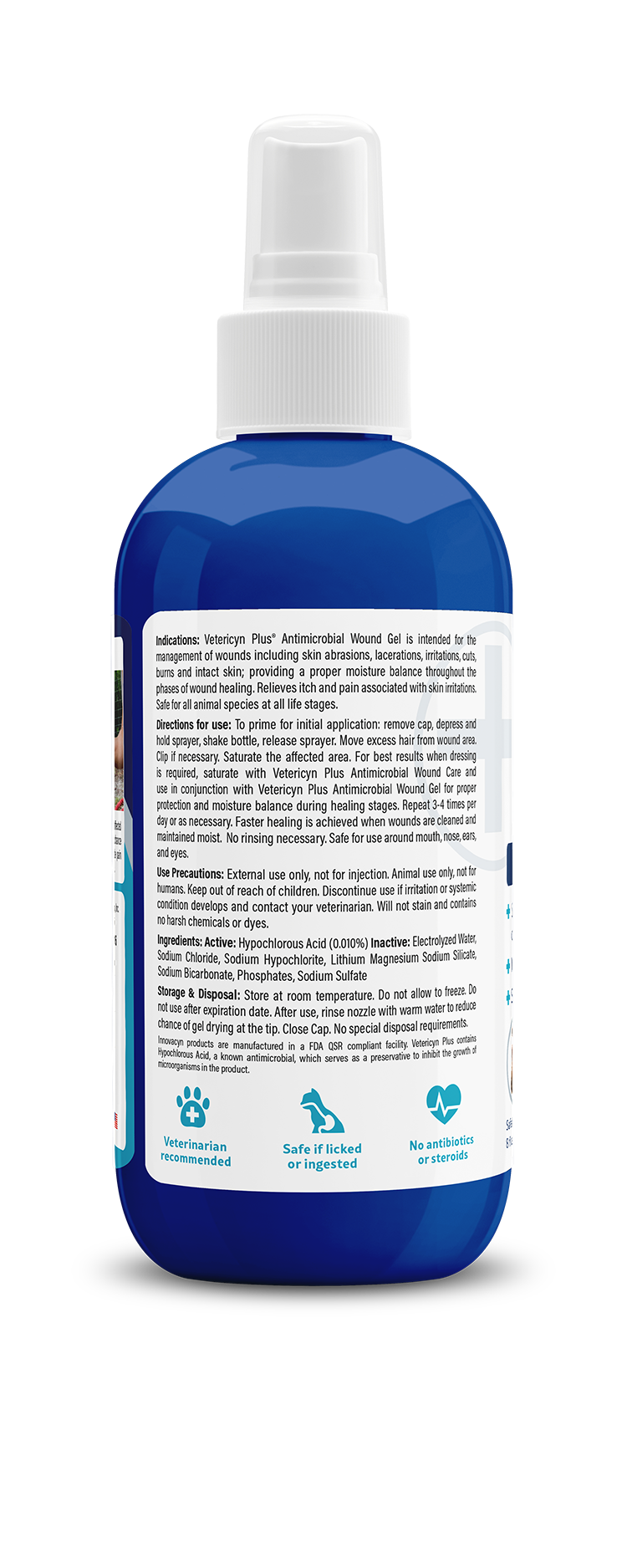 Vetericyn Plus All Animal Antimicrobial Hydrogel is an easy-to-use sprayable wound gel to help your pet quickly relieve skin irritations or wounds. Use the Antimicrobial Hydrogel spray a few times daily on the affected area to help promote healing. With Vetericyn's non-toxic formula, it is safe if your pet licks the product. Vetericyn Plus Antimicrobial Hydrogel also works great with Vetericyn Plus All Animal Wound & Skin Care spray.