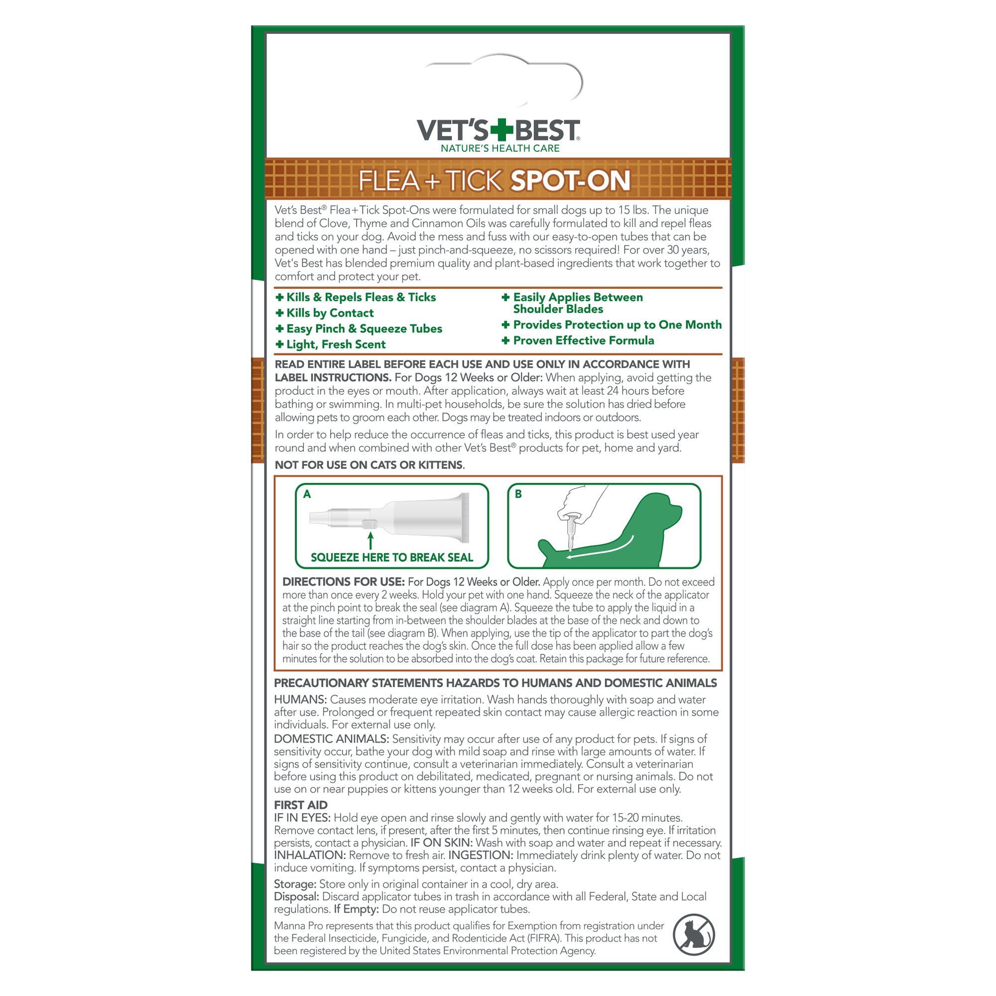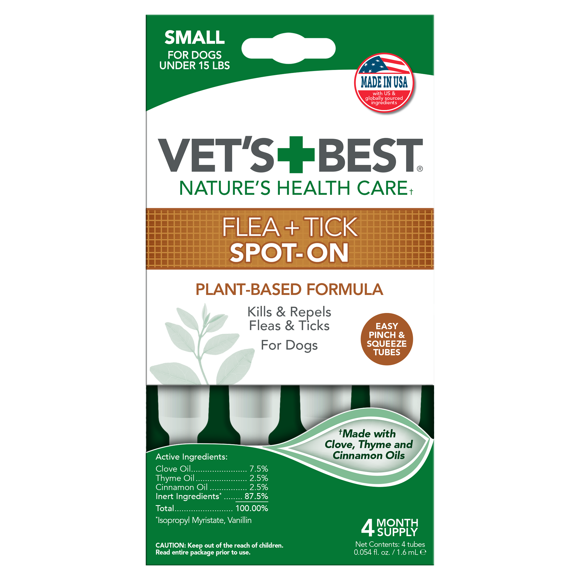 Shop / Unknown Type / Vet's Best Flea and Tick Spot-On Small 4ct. Vet's Best Flea and Tick Spot-On Small 4ct. Vet's Best 4ct $17.99 4ct Purchase Options Free In-Store Pick Up Not Available Save 10% on orders $49+ Set your store for inventory and store pickup details Zip Code Search Same-day Delivery* No minimum charge for delivery orders. *Order before 2pm and have it delivered today. Orders placed after 2pm will be delivered the next day. Must be inside delivery radius. Zip Code Unfortunately delivery is not available to this address. In order to ensure the best availability accuracy, changing your selected store will remove all items from your cart. You will need to re-add these items with your newly selected store if you choose to continue. Continue Cancel Ship it to Me Quantity Add To Cart Information Looking for a natural and effective flea treatment for your furry friend? Look no further! Our certified natural Vet's Best Flea and Tick Spot-on Drops is made with ingredients like clove, thyme, and cinnamon oil, making it a safe and reliable choice for your pup. In addition to being a natural flea medicine for dogs, it also acts as a comprehensive tick and flea prevention solution, effectively safeguarding your pet from dangerous parasites. Our veterinarian formulated dog flea treatment is easy to use with a dropper applicator, ensuring accurate application. Plus, it's made in the USA with high-quality domestic and internationally sourced ingredients, ensuring that you are providing the best care possible for you beloved furry friend. Don't let fleas and ticks bother your furry friend any longer, try our flea treatment for dogs today and experience the benefits of natural flea and tick prevention for dogs! Ingredients: Clove Oil 7.5%, Thyme Oil 2.5%, Cinnamon Oil 2.5%, Inert Ingredients 87.5% (isopropyl myristate, vanilin) Customers also liked Customer Reviews
