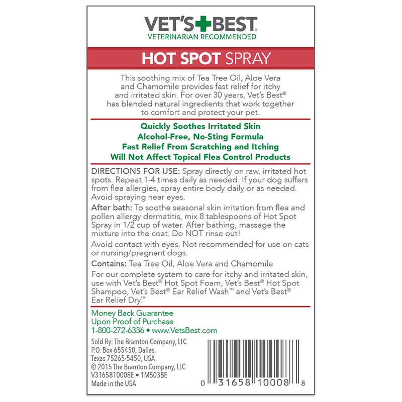 Shop / Unknown Type / Vet's Best Hot Spot Spray 8oz Vet's Best Hot Spot Spray 8oz Vet's Best 8oz $12.99 8oz Purchase Options Free In-Store Pick Up Not Available Save 10% on orders $49+ Set your store for inventory and store pickup details Zip Code Search Same-day Delivery* No minimum charge for delivery orders. *Order before 2pm and have it delivered today. Orders placed after 2pm will be delivered the next day. Must be inside delivery radius. Zip Code Unfortunately delivery is not available to this address. In order to ensure the best availability accuracy, changing your selected store will remove all items from your cart. You will need to re-add these items with your newly selected store if you choose to continue. Continue Cancel Ship it to Me Quantity Add To Cart Information Vet’s Best Hot Spot Spray provides a welcome relief for your dog's itchy, dry, and irritated skin. Our veterinarian-formulated and recommended blend of natural key ingredients, including tea tree oil, aloe vera, and chamomile, provides fast relief for your dog’s itching and scratching. The alcohol-free, no-sting formula is a soothing solution for hot spots as well as seasonal allergies and environmental irritants. Ingredients: Tea Trea Oil, Aloe Vera, and Chamomile Customers also liked Customer Reviews