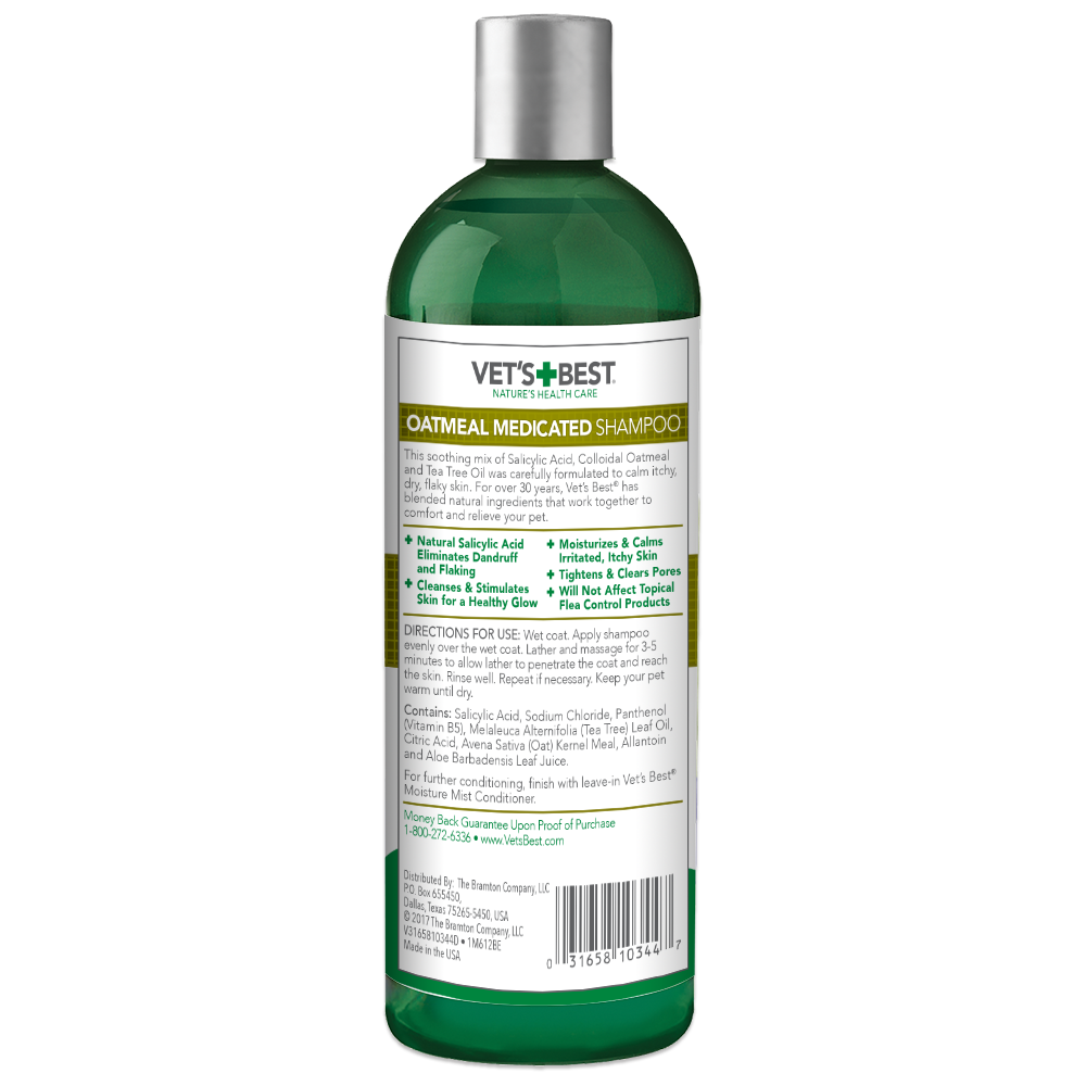 Shop / Unknown Type / Vet's Best Oatmeal Medicated Shampoo 16oz Vet's Best Oatmeal Medicated Shampoo 16oz Vet's Best 16oz $14.99 16oz Purchase Options Free In-Store Pick Up Not Available Save 10% on orders $49+ Set your store for inventory and store pickup details Zip Code Search Same-day Delivery* No minimum charge for delivery orders. *Order before 2pm and have it delivered today. Orders placed after 2pm will be delivered the next day. Must be inside delivery radius. Zip Code Unfortunately delivery is not available to this address. In order to ensure the best availability accuracy, changing your selected store will remove all items from your cart. You will need to re-add these items with your newly selected store if you choose to continue. Continue Cancel Ship it to Me Quantity Add To Cart Information Calm and moisturize itchy, dry, flaky skin with Vet's Best Oatmeal Medicated Dog Shampoo. Our veterinarian-formulated shampoo is a soothing mix of salicylic acid and key natural ingredients (including colloidal oatmeal, tea tree oil, and vitamin B5) that eliminates dandruff and flaking; clears and tightens pores; and cleans and stimulates your dog’s skin for a healthy glow. Will not affect topical flea and tick control products. Ingredients: salicylic acid, sodium chloride, panthenol (vitamin B5), melaleuca algernifolia (tea tree) leaf oil, citric acid, avena sativa (oat) kernal meal, allantoin, and aloe barbadensis leaf juice Customers also liked Customer Reviews