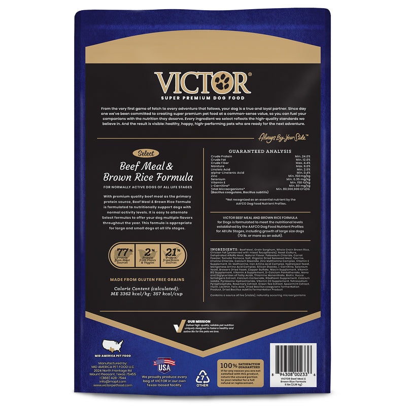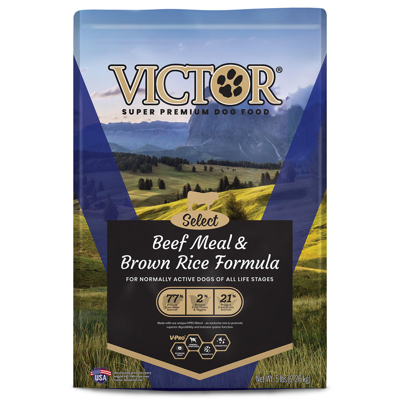 Shop / Unknown Type / Victor Beef Meal & Rice Dry Dog Food, 5lb Victor Beef Meal & Rice Dry Dog Food, 5lb Victor 5lb $13.99 5lb Purchase Options Free In-Store Pick Up Not Available Save 10% on orders $49+ Set your store for inventory and store pickup details Zip Code Search Same-day Delivery* No minimum charge for delivery orders. *Order before 2pm and have it delivered today. Orders placed after 2pm will be delivered the next day. Must be inside delivery radius. Zip Code Unfortunately delivery is not available to this address. In order to ensure the best availability accuracy, changing your selected store will remove all items from your cart. You will need to re-add these items with your newly selected store if you choose to continue. Continue Cancel Ship it to Me Quantity Add To Cart Feeding guide disclaimer ✕ Feeding guides provide a starting point for the amount of food to give your pet each day. We recommend that you keep your pet in ideal body condition and not allow them to become overweight. The amount of food your pet needs can vary based on age, activity level or other food and treats given, so be sure to work with your veterinarian to determine an appropriate weight for your pet, and to make any necessary adjustments to their feeding. Information With premium-quality beef meal as the primary protein source, Beef Meal & Brown Rice Formula is formulated to nutritionally support dogs with normal activity levels. It is easy to alternate SELECT formulas to offer your dog multiple flavors throughout the year. This formula is appropriate for large and small dogs at all life stages. VICTOR Beef Meal & Brown Rice Formula for Dogs is formulated to meet the nutritional levels established by the AAFCO Dog Food Nutrient Profiles for All Life Stages, including growth of large size dogs (70 lb. or more as an adult) Ingredients Beef Meal, Grain Sorghum, Whole Grain Brown Rice, Chicken Fat (preserved with mixed Tocopherols), Yeast Culture, Dehydrated Alfalfa Meal, Natural Flavor, Potassium Chloride, Carrot Powder, Tomato Pomace, Salt, Organic Dried Seaweed Meal, Taurine, Choline Chloride, Calcium Stearate, Zinc Methionine Complex, Vitamin E Supplement, DL-Methionine, Iron Amino Acid Complex, Hydrolyzed Yeast, Manganese Amino Acid Complex, Silicon Dioxide, L-Carnitine, Selenium Yeast, Brewers Dried Yeast, Copper Sulfate, Niacin Supplement, Vitamin B12 Supplement, Vitamin A Supplement, D-Calcium Pantothenate, Mono and Diglycerides of Fatty Acids, Thiamine Mononitrate, Biotin, Yucca Schidigera Extract, Calcium Carbonate, Riboflavin Supplement, Calcium Iodate, Pyridoxine Hydrochloride, Vitamin D3 Supplement, Tetrasodium Pyrophosphate, Rosemary Extract, Green Tea Extract, Spearmint Extract, Inulin, Lecithin, Folic Acid, Dried Bacillus coagulans Fermentation Product, Dried Bacillus subtilis Fermentation Product Contains a source of live (viable), naturally occurring microorganisms Guaranteed Analysis Crude Protein (Min.) 24.0%, Crude Fat (Min.) 12.0%, Crude Fiber (Max.) 4.4%, Moisture (Max.) 9.0%, Linoleic Acid (Min.) 2.0%, alpha-Linolenic Acid (Min.) 0.4%, Zinc (Min.) 150 mg/kg, Selenium (Min.) 0.35 mg/kg, Vitamin E (Min.) 150 IU/kg, L-Carnitine* (Min.) 80 mg/kg, Total Microorganisms* (Min) 80,000,000 CFU/lb (Bacillus coagulans, Bacillus subtilis) Customers also liked Customer Reviews