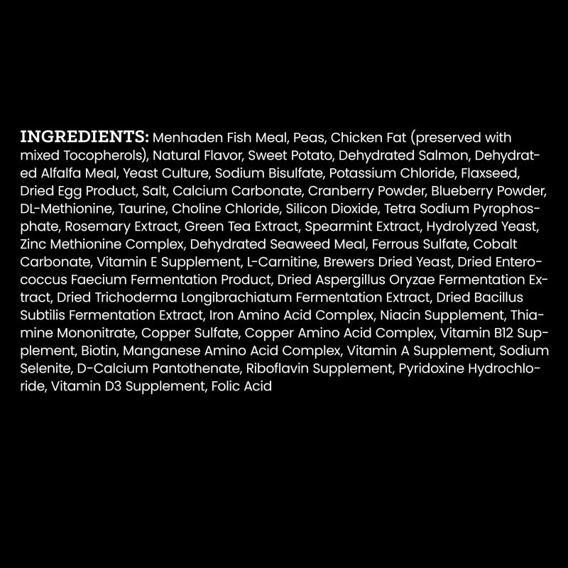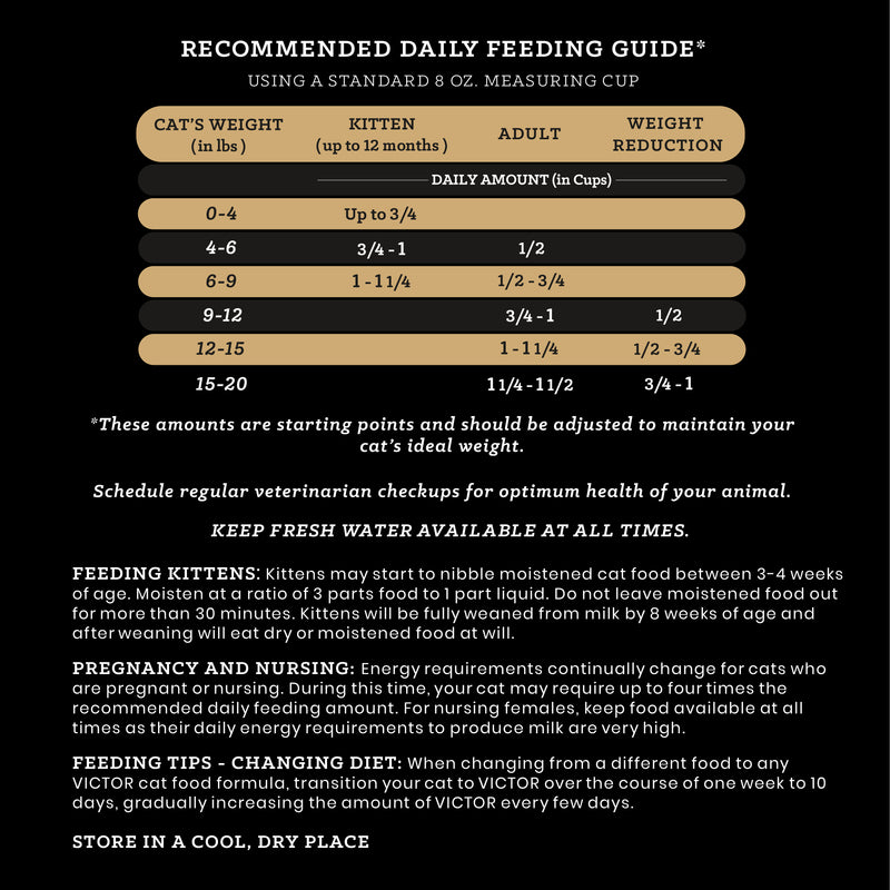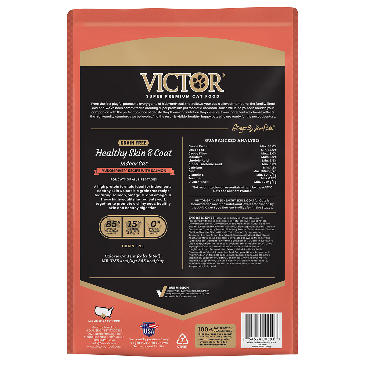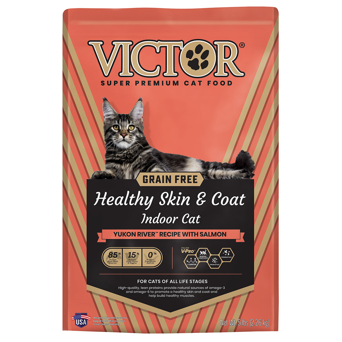 Shop / Unknown Type / Victor Grain Free Healthy Skin & Coat Indoor Cat Food Victor Grain Free Healthy Skin & Coat Indoor Cat Food Victor 5lb $17.99 5lb Purchase Options Free In-Store Pick Up Not Available Save 10% on orders $49+ Set your store for inventory and store pickup details Zip Code Search Same-day Delivery* No minimum charge for delivery orders. *Order before 2pm and have it delivered today. Orders placed after 2pm will be delivered the next day. Must be inside delivery radius. Zip Code Unfortunately delivery is not available to this address. In order to ensure the best availability accuracy, changing your selected store will remove all items from your cart. You will need to re-add these items with your newly selected store if you choose to continue. Continue Cancel Ship it to Me Quantity Add To Cart Feeding guide disclaimer ✕ Feeding guides provide a starting point for the amount of food to give your pet each day. We recommend that you keep your pet in ideal body condition and not allow them to become overweight. The amount of food your pet needs can vary based on age, activity level or other food and treats given, so be sure to work with your veterinarian to determine an appropriate weight for your pet, and to make any necessary adjustments to their feeding. Information A high protein formula ideal for indoor cats, Healthy Skin & Coat is a grain free recipe featuring high-quality ingredients like salmon, omega-3 and omega-6. Specially formulated to promote healthy skin and a shiny coat, this recipe will also offer digestive aid for your cat through all life stages. VICTOR Grain Free Healthy Skin & Coat for Cats is formulated to meet the nutritional levels established by the AAFCO Cat Food Nutrient Profiles for All Life Stages. High-quality, lean proteins provide natural sources of omega-3 and omega-6 to promote a healthy skin and coat and help build strong muscles Grain free formula featuring salmon as a quality source of protein with a taste cats love Packed with vitamins, minerals, amino acids and quality proteins Made with our proprietary Feline VPRO Blend - a mix of ingredients that work to provide super premium nutrition to your cat while supporting a healthy coat, promoting digestive and immune system function, and maintaining healthy weight Every bag of VICTOR kibble is produced in our own Texas-based facility, with a majority of ingredients coming from ranches, farms and other trusted suppliers who are within a day‰۪s drive of our plant Ingredients Menhaden Fish Meal, Peas, Chicken Fat (preserved with mixed Tocopherols), Natural Flavor, Sweet Potato, Dehydrated Salmon, Dehydrated Alfalfa Meal, Yeast Culture, Sodium Bisulfate, Potassium Chloride, Flaxseed, Dried Egg Product, Salt, Calcium Carbonate, Cranberry Powder, Blueberry Powder, DL-Methionine, Taurine, Choline Chloride, Silicon Dioxide, Tetra Sodium Pyrophosphate, Rosemary Extract, Green Tea Extract, Spearmint Extract, Hydrolyzed Yeast, Zinc Methionine Complex, Dehydrated Seaweed Meal, Ferrous Sulfate, Cobalt Carbonate, Vitamin E Supplement, L-Carnitine, Brewers Dried Yeast, Dried Enterococcus Faecium Fermentation Product, Dried Aspergillus Oryzae Fermentation Extract, Dried Trichoderma Longibrachiatum Fermentation Extract, Dried Bacillus Subtilis Fermentation Extract, Iron Amino Acid Complex, Niacin Supplement, Thiamine Mononitrate, Copper Sulfate, Copper Amino Acid Complex, Vitamin B12 Supplement, Biotin, Manganese Amino Acid Complex, Vitamin A Supplement, Sodium Selenite, D-Calcium Pantothenate, Riboflavin Supplement, Pyridoxine Hydrochloride, Vitamin D3 Supplement, Folic Acid Guaranteed Analysis Crude Protein 38.0% min, Crude Fat 16.0% min, Crude Fiber 3.0% max, Moisture 9.0% max, Linoleic Acid 2.5% min, alpha-Linolenic Acid 0.6% min, Calcium 1.2% min, Zinc 100 mg/kg min, Vitamin, E 80 IU/kg min, Taurine 0.15% min, L-Carnitine* 80 mg/kg min *Not recognized as an essential nutrient by AAFCO Customers also liked Customer Reviews