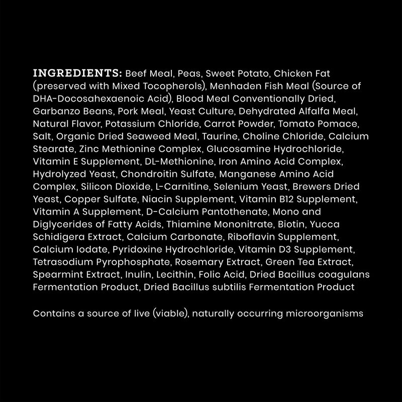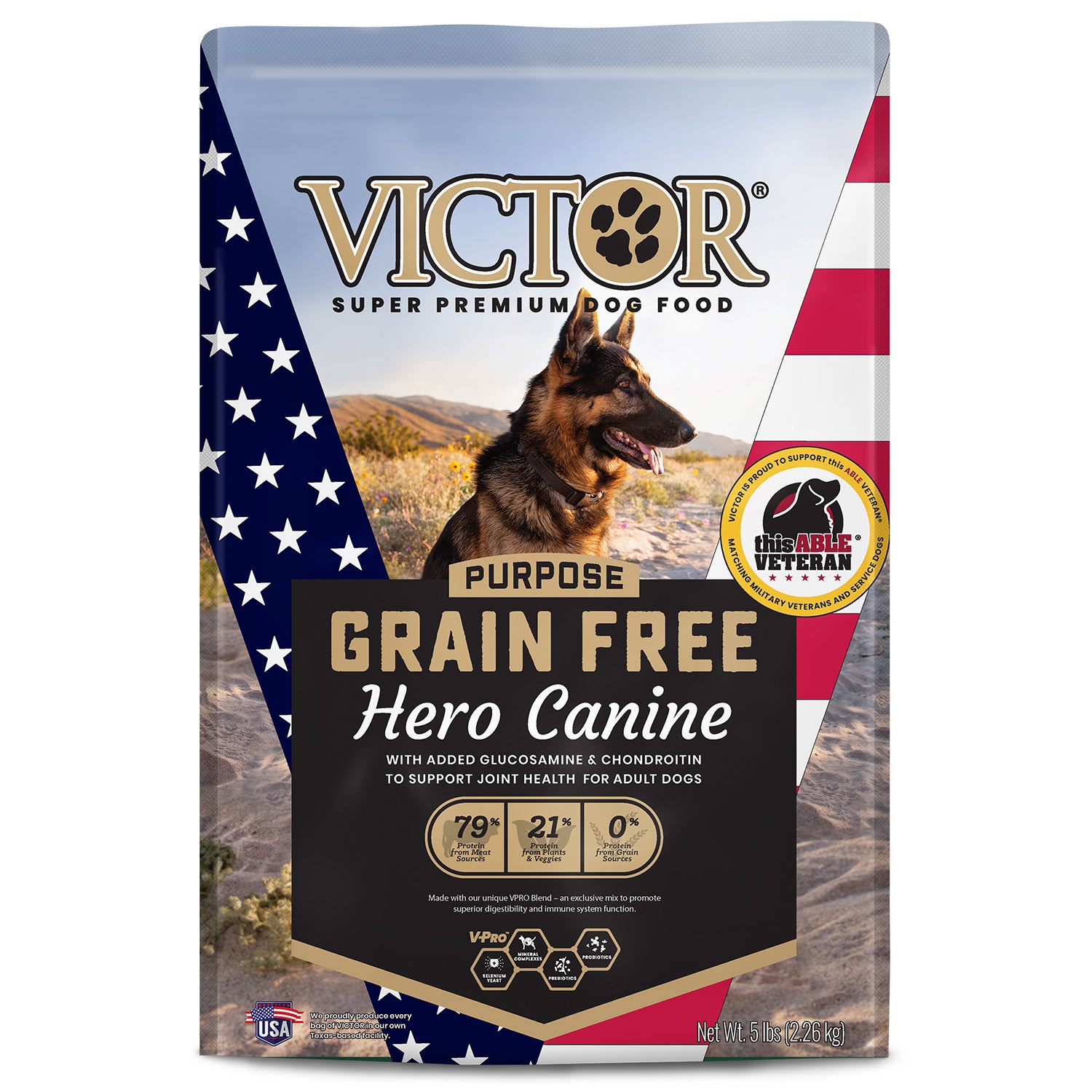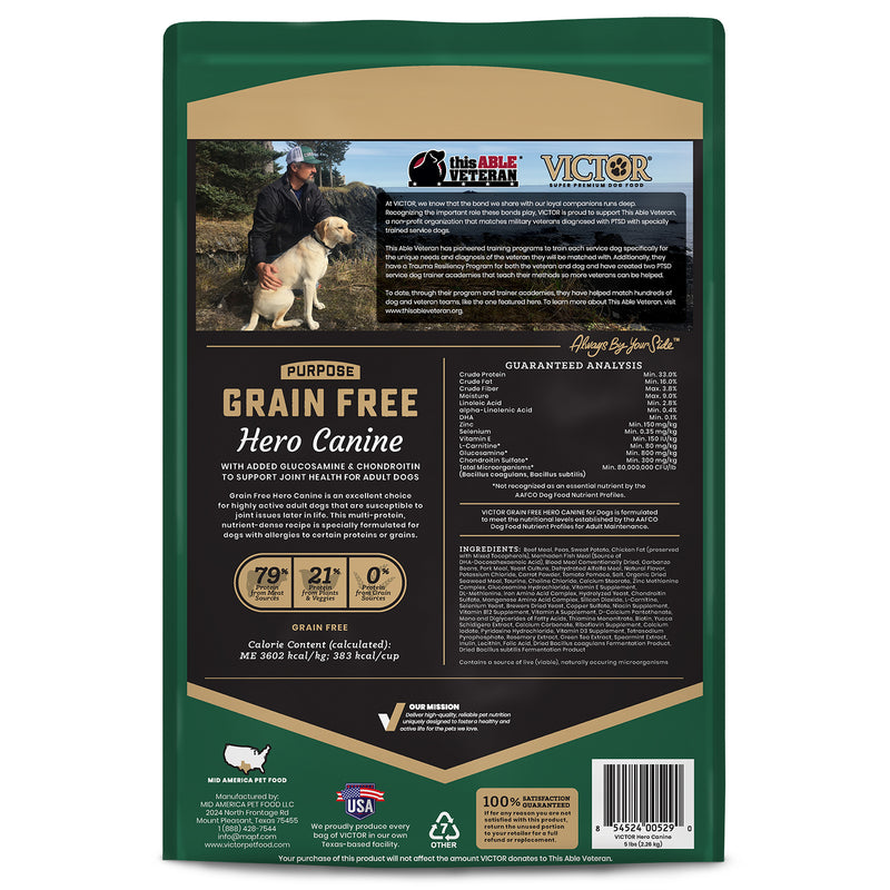Shop / Unknown Type / Victor Grain Free Hero Dry Dog Food, 5lb Victor Grain Free Hero Dry Dog Food, 5lb Victor 5lb $15.99 5lb Purchase Options Free In-Store Pick Up Not Available Save 10% on orders $49+ Set your store for inventory and store pickup details Zip Code Search Same-day Delivery* No minimum charge for delivery orders. *Order before 2pm and have it delivered today. Orders placed after 2pm will be delivered the next day. Must be inside delivery radius. Zip Code Unfortunately delivery is not available to this address. In order to ensure the best availability accuracy, changing your selected store will remove all items from your cart. You will need to re-add these items with your newly selected store if you choose to continue. Continue Cancel Ship it to Me Quantity Add To Cart Feeding guide disclaimer ✕ Feeding guides provide a starting point for the amount of food to give your pet each day. We recommend that you keep your pet in ideal body condition and not allow them to become overweight. The amount of food your pet needs can vary based on age, activity level or other food and treats given, so be sure to work with your veterinarian to determine an appropriate weight for your pet, and to make any necessary adjustments to their feeding. Information VICTOR Grain-Free Hero Canine is an excellent choice for highly active adult dogs that are susceptible to joint issues later in life. This multi-protein, nutrient-dense recipe is specially formulated for dogs with allergies to certain proteins or grains.VICTOR Grain-Free Hero Canine for Dogs is formulated to meet the nutritional levels established by the AAFCO Dog Food Nutrient Profiles for Adult Maintenance. Grain-Free for dogs with allergies or sensitivity to grain Ideal for highly active adult dogs that are susceptible to joint issues later. Glucosamine and Chondroitin promote long-term joint health. This nutrient-dense recipe is made with premium-quality beef, pork and fish meals to provide sustained energy Fortified with vitamins, minerals, essential fatty acids, protein and amino acids Made with our unique VPRO Blend - an exclusive mix to promote superior digestibility and immune system function Ingredients Beef Meal, Peas, Sweet Potato, Chicken Fat (preserved with Mixed Tocopherols), Menhaden Fish Meal (Source of DHA-Docosahexaenoic Acid), Blood Meal Conventionally Dried, Garbanzo Beans, Pork Meal, Yeast Culture, Dehydrated Alfalfa Meal, Natural Flavor, Potassium Chloride, Carrot Powder, Tomato Pomace, Salt, Organic Dried Seaweed Meal, Taurine, Choline Chloride, Calcium Stearate, Zinc Methionine Complex, Glucosamine Hydrochloride, Vitamin E Supplement, DL-Methionine, Iron Amino Acid Complex, Hydrolyzed Yeast, Chondroitin Sulfate, Manganese Amino Acid Complex, Silicon Dioxide, L-Carnitine, Selenium Yeast, Brewers Dried Yeast, Copper Sulfate, Niacin Supplement, Vitamin B12 Supplement, Vitamin A Supplement, D-Calcium Pantothenate, Mono and Diglycerides of Fatty Acids, Thiamine Mononitrate, Biotin, Yucca Schidigera Extract, Calcium Carbonate, Riboflavin Supplement, Calcium Iodate, Pyridoxine Hydrochloride, Vitamin D3 Supplement, Tetrasodium Pyrophosphate, Rosemary Extract, Green Tea Extract, Spearmint Extract, Inulin, Lecithin, Folic Acid, Dried Bacillus coagulans Fermentation Product, Dried Bacillus subtilis Fermentation Product Contains a source of live (viable), naturally occurring microorganisms Guaranteed Analysis Crude Protein (Min.) 33.0% Crude Fat (Min.) 16.0% Crude Fiber (Max.) 3.8% Moisture (Max.) 9.0% Linoleic Acid (Min.) 2.8% alpha-Linolenic Acid (Min.) 0.4% DHA (Min.) 0.10% Zinc (Min.) 150 mg/kg Selenium (Min.) 0.35 mg/kg Vitamin E (Min.) 150 IU/kg L-Carnitine* (Min.) 80 mg/kg Glucosamine* (Min.) 800 mg/kg Chondroitin Sulfate* (Min.) 300 mg/kg Total Microorganisms* (Min) 80,000,000 CFU/lb (Bacillus coagulans, Bacillus subtilis) Customers also liked Customer Reviews