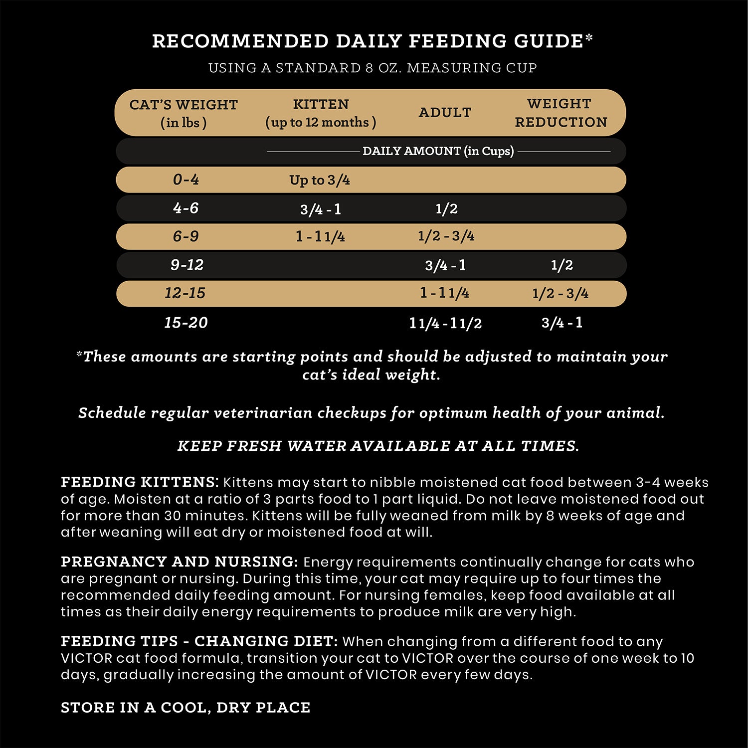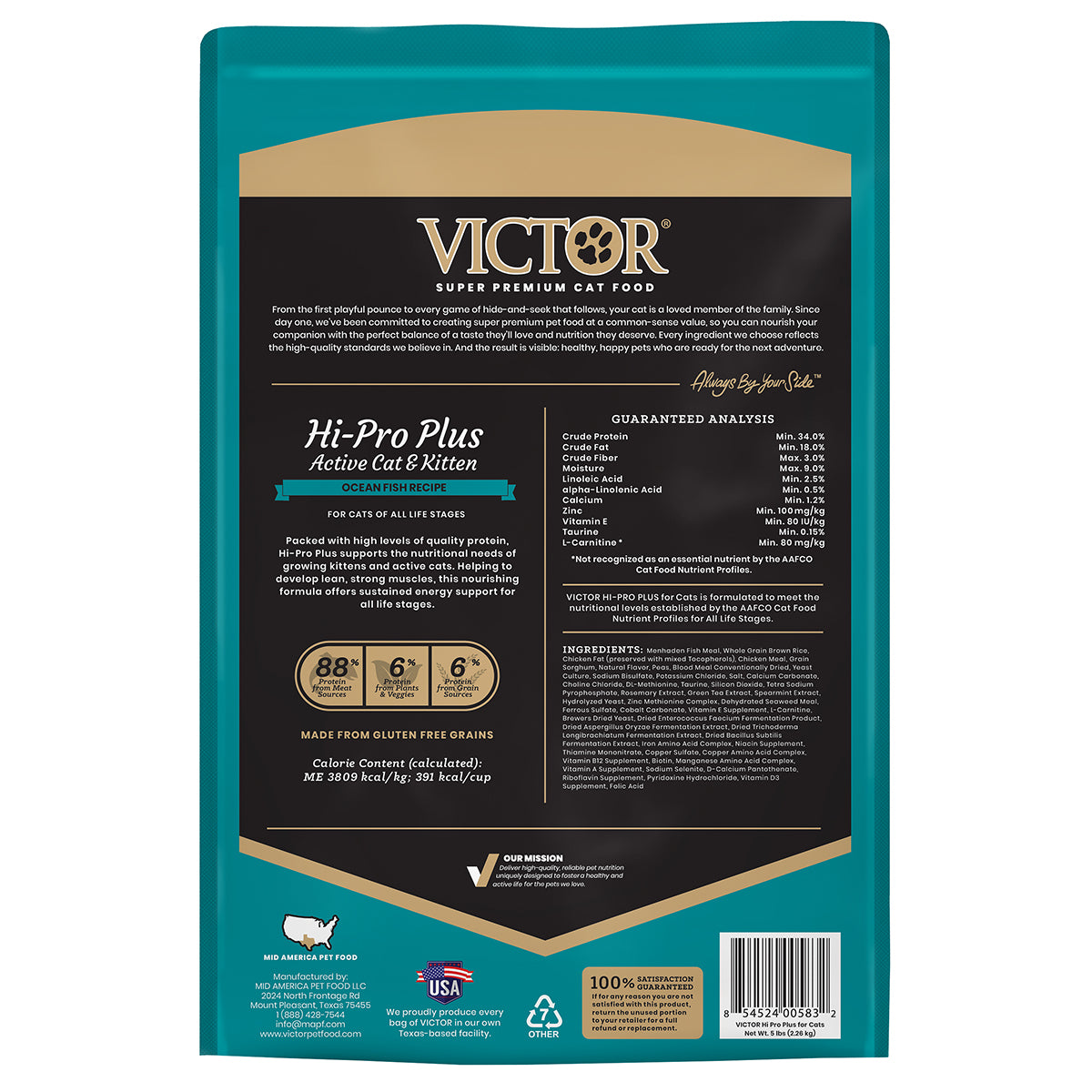 Shop / Unknown Type / Victor Hi Pro Plus Active Cat & Kitten Dry Cat Food Victor Hi Pro Plus Active Cat & Kitten Dry Cat Food Victor 5lb $16.99 5lb Purchase Options Free In-Store Pick Up Not Available Save 10% on orders $49+ Set your store for inventory and store pickup details Zip Code Search Same-day Delivery* No minimum charge for delivery orders. *Order before 2pm and have it delivered today. Orders placed after 2pm will be delivered the next day. Must be inside delivery radius. Zip Code Unfortunately delivery is not available to this address. In order to ensure the best availability accuracy, changing your selected store will remove all items from your cart. You will need to re-add these items with your newly selected store if you choose to continue. Continue Cancel Ship it to Me Quantity Add To Cart Feeding guide disclaimer ✕ Feeding guides provide a starting point for the amount of food to give your pet each day. We recommend that you keep your pet in ideal body condition and not allow them to become overweight. The amount of food your pet needs can vary based on age, activity level or other food and treats given, so be sure to work with your veterinarian to determine an appropriate weight for your pet, and to make any necessary adjustments to their feeding. Information Packed with high levels of quality protein, Hi-Pro Plus supports the nutritional needs of growing kittens and active cats. Helping to develop lean, strong muscles, this nourishing formula offers sustained energy support for all life stages.VICTOR Hi-Pro Plus for Cats is formulated to meet the nutritional levels established by the AAFCO Cat Food Nutrient Profiles for All Life Stages. High levels of quality protein to provide sustained energy and support muscle development for growing kittens and active cats An ideal formula for all life stages, including pregnant and nursing females Packed with vitamins, minerals, amino acids and quality proteins Made with our proprietary Feline VPRO Blend - a mix of ingredients that work to provide super premium nutrition to your cat while supporting a healthy coat, promoting digestive and immune system function, and maintaining healthy weight Every bag of VICTOR kibble is produced in our own Texas-based facility, with a majority of ingredients coming from ranches, farms and other trusted suppliers who are within a day‰۪s drive of our plant Ingredients Menhaden Fish Meal, Whole Grain Brown Rice, Chicken Fat (preserved with mixed Tocopherols), Chicken Meal, Grain Sorghum, Natural Flavor, Peas, Blood Meal Conventionally Dried, Yeast Culture, Sodium Bisulfate, Potassium Chloride, Salt, Calcium Carbonate, Choline Chloride, DL-Methionine, Taurine, Silicon Dioxide, Tetra Sodium Pyrophosphate, Rosemary Extract, Green Tea Extract, Spearmint Extract, Hydrolyzed Yeast, Zinc Methionine Complex, Dehydrated Seaweed Meal, Ferrous Sulfate, Cobalt Carbonate, Vitamin E Supplement, L-Carnitine, Brewers Dried Yeast, Dried Enterococcus Faecium Fermentation Product, Dried Aspergillus Oryzae Fermentation Extract, Dried Trichoderma Longibrachiatum Fermentation Extract, Dried Bacillus Subtilis Fermentation Extract, Iron Amino Acid Complex, Niacin Supplement, Thiamine Mononitrate, Copper Sulfate, Copper Amino Acid Complex, Vitamin B12 Supplement, Biotin, Manganese Amino Acid Complex, Vitamin A Supplement, Sodium Selenite, D-Calcium Pantothenate, Riboflavin Supplement, Pyridoxine Hydrochloride, Vitamin D3 Supplement, Folic Acid Guaranteed Analysis Crude Protein 34.0% min, Crude Fat 18.0% min, Crude Fiber 3.0% max, Moisture 9.0% max, Linoleic Acid 2.5% min, alpha-Linolenic Acid 0.5% min, Calcium 1.2% min, Zinc 100 mg/kg min, Vitamin, E 80 IU/kg min, Taurine 0.15% min, L-Carnitine* 80 mg/kg min* Not Recognized as an essential nutrient by AAFCO Nutritional Profile for Cats. Customers also liked Customer Reviews