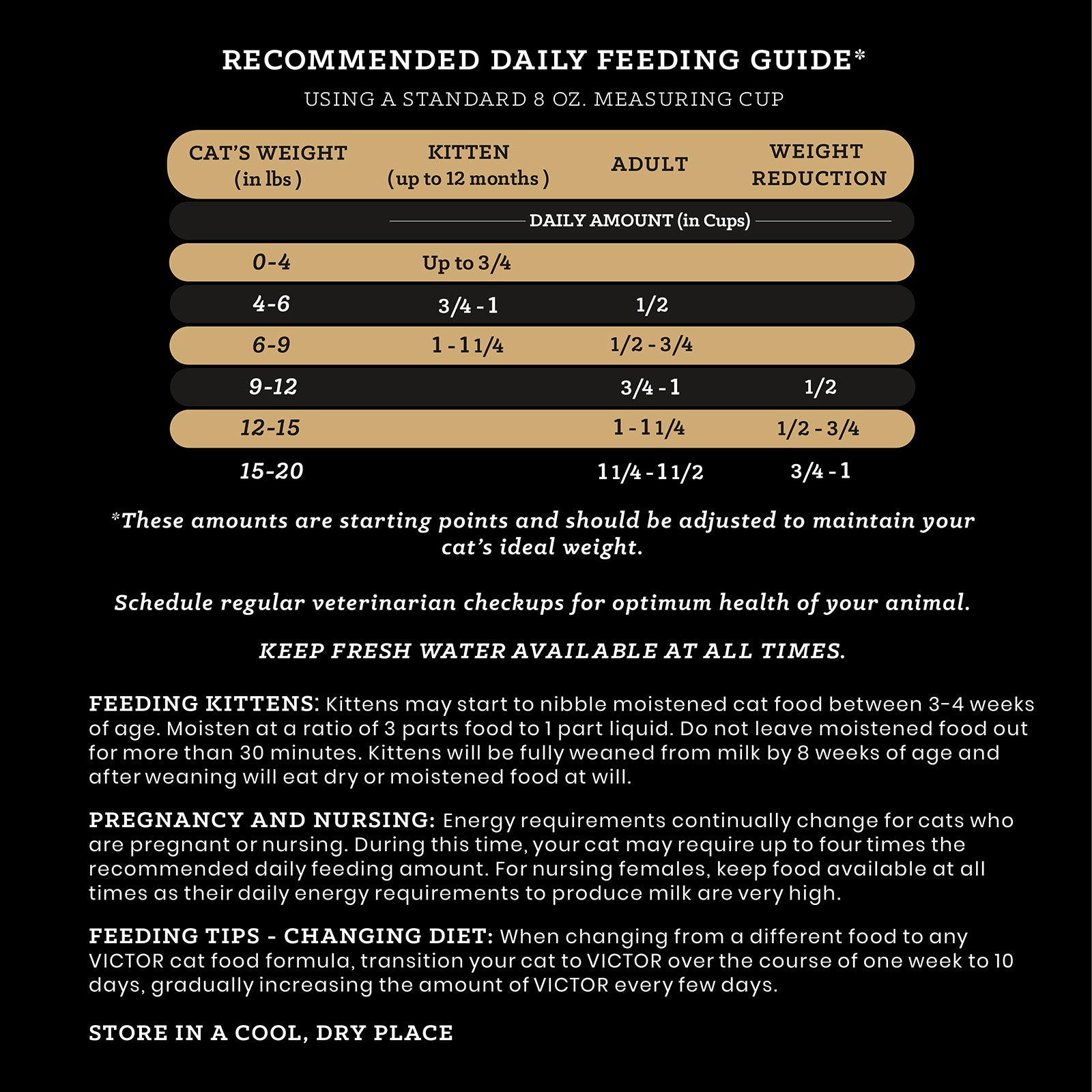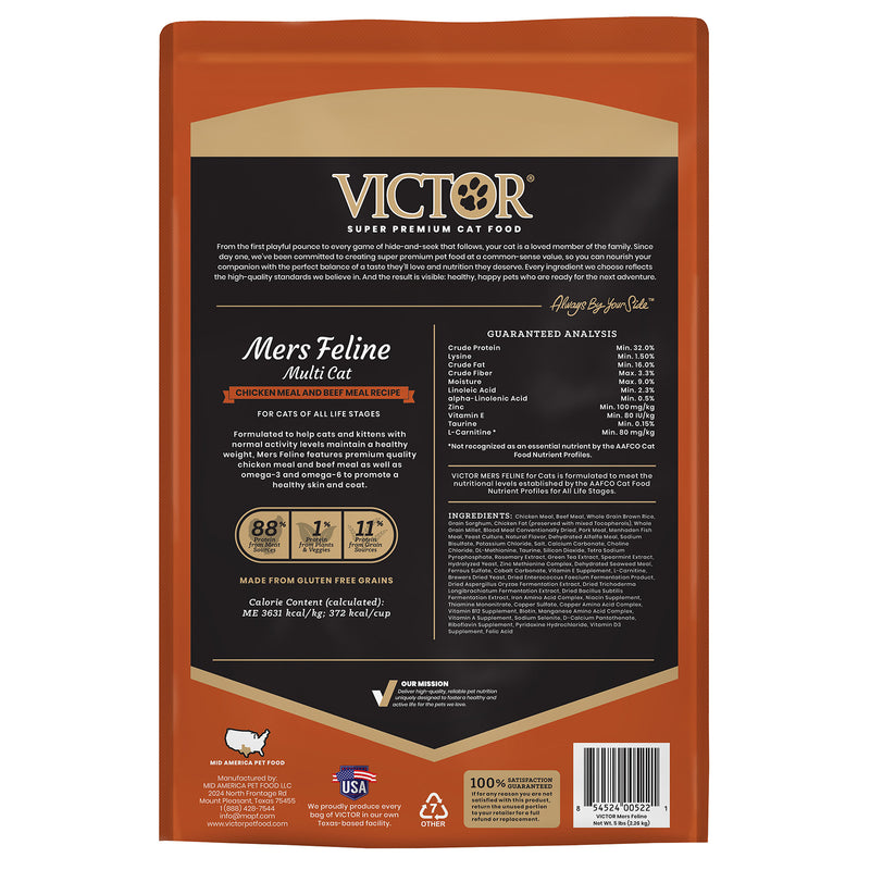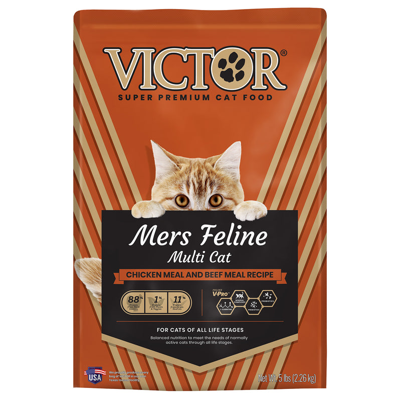 Shop / Unknown Type / Victor Mers Classic Dry Cat Food Victor Mers Classic Dry Cat Food Victor 5lb $13.99 5lb Purchase Options Free In-Store Pick Up Not Available Save 10% on orders $49+ Set your store for inventory and store pickup details Zip Code Search Same-day Delivery* No minimum charge for delivery orders. *Order before 2pm and have it delivered today. Orders placed after 2pm will be delivered the next day. Must be inside delivery radius. Zip Code Unfortunately delivery is not available to this address. In order to ensure the best availability accuracy, changing your selected store will remove all items from your cart. You will need to re-add these items with your newly selected store if you choose to continue. Continue Cancel Ship it to Me Quantity Add To Cart Feeding guide disclaimer ✕ Feeding guides provide a starting point for the amount of food to give your pet each day. We recommend that you keep your pet in ideal body condition and not allow them to become overweight. The amount of food your pet needs can vary based on age, activity level or other food and treats given, so be sure to work with your veterinarian to determine an appropriate weight for your pet, and to make any necessary adjustments to their feeding. Information Mers Feline is formulated to help cats with normal activity levels maintain a healthy weight. Omega 3 and Omega 6 promote a healthy skin and coat, and L-Carnitine aids in converting fat to energy for lean muscle development. Vitamin E and Selenium work together to support a healthy immune system, and healthy levels of fiber support digestion.VICTOR Mers Feline for Cats is formulated to meet the nutritional levels established by the AAFCO Cat Food Nutrient Profiles for All Life Stages. No artificial flavors, coloring or preservatives Supports a healthy immune system, digestion and satiation All Life Stages formula with balanced nutrition for kittens to adults Promotes lean muscle development and healthy weight, skin and coat Ingredients Chicken Meal, Beef Meal, Whole Grain Brown Rice, Grain Sorghum, Chicken Fat (preserved with mixed Tocopherols), Whole Grain Millet, Blood Meal Conventionally Dried, Pork Meal, Menhaden Fish Meal, Yeast Culture, Natural Flavor, Dehydrated Alfalfa Meal, Sodium Bisulfate, Potassium Chloride, Salt, Calcium Carbonate, Choline Chloride, DL-Methionine, Taurine, Silicon Dioxide, Tetra Sodium Pyrophosphate, Rosemary Extract, Green Tea Extract, Spearmint Extract, Hydrolyzed Yeast, Zinc Methionine Complex, Dehydrated Seaweed Meal, Ferrous Sulfate, Cobalt Carbonate, Vitamin E Supplement, L-Carnitine, Brewers Dried Yeast, Dried Enterococcus Faecium Fermentation Product, Dried Aspergillus Oryzae Fermentation Extract, Dried Trichoderma Longibrachiatum Fermentation Extract, Dried Bacillus Subtilis Fermentation Extract, Iron Amino Acid Complex, Niacin Supplement, Thiamine Mononitrate, Copper Sulfate, Copper Amino Acid Complex, Vitamin B12 Supplement, Biotin, Manganese Amino Acid Complex, Vitamin A Supplement, Sodium Selenite, D-Calcium Pantothenate, Riboflavin Supplement, Pyridoxine Hydrochloride, Vitamin D3 Supplement, Folic Acid Guaranteed Analysis Crude Protein (min) 32.0%, Lysine (min) 1.50%, Crude Fat (min) 16.0%, Crude Fiber (max) 3.3%, Moisture (max) 9.0%, Linoleic Acid (min) 2.3%, alpha-Linolenic Acid (min) 0.5%, Zinc (min) 100 mg/kg, Vitamin E (min) 80 IU/kg, Taurine (min) 0.15%, L-Carnitine* (min) 80 mg/kg *Not recognized as essential nutrient by the AAFCO Customers also liked Customer Reviews