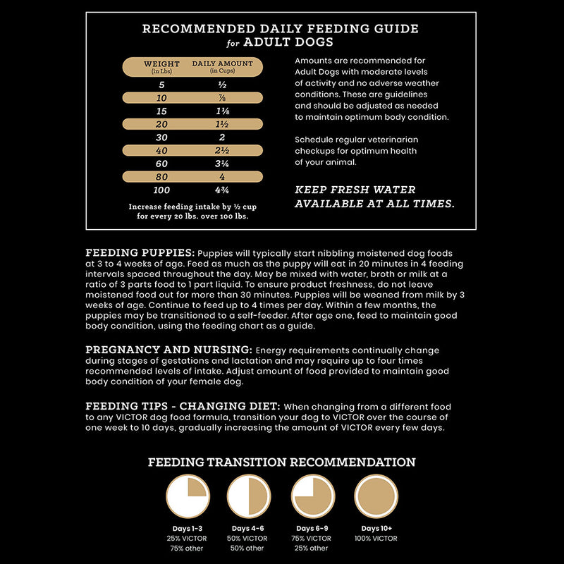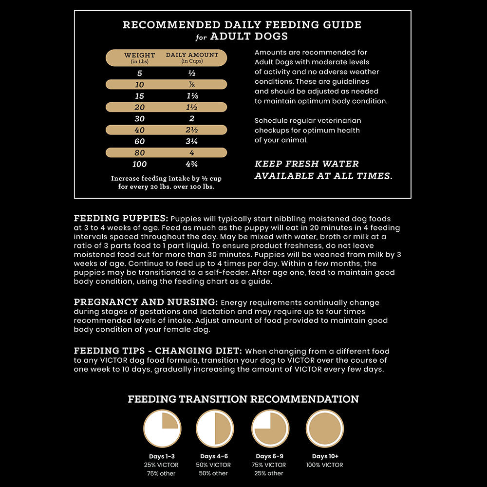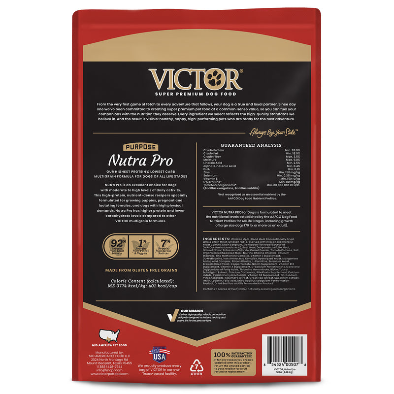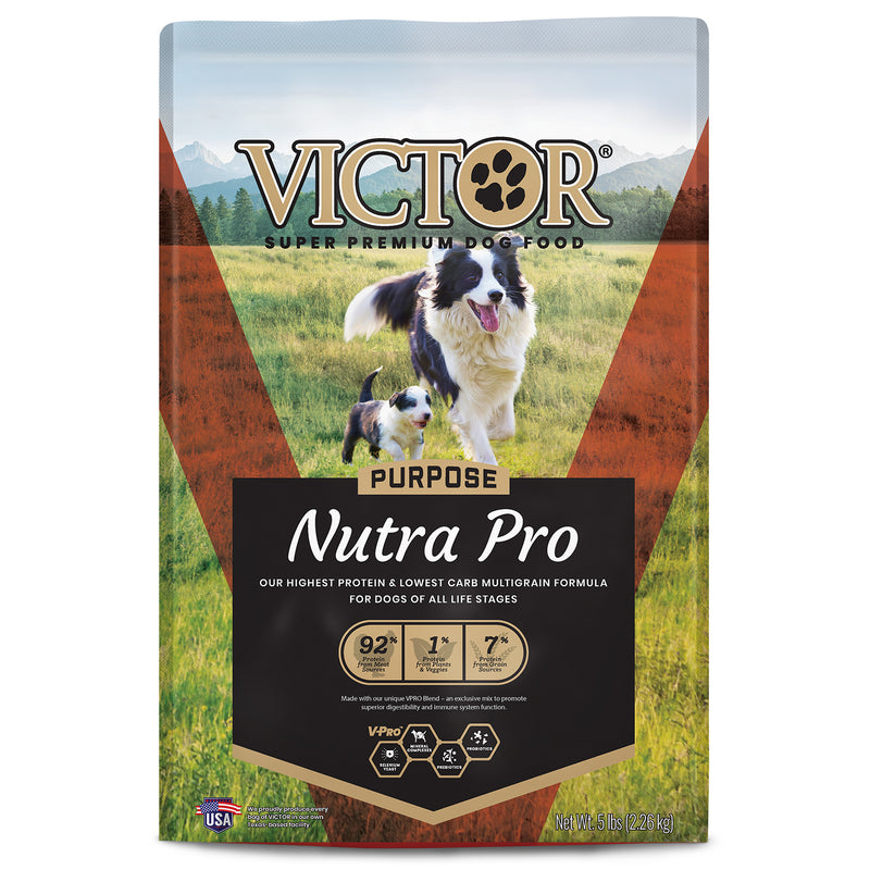 Shop / Unknown Type / Victor Nutra Pro Dry Dog food, 5lb Victor Nutra Pro Dry Dog food, 5lb Victor 5lb $14.99 5lb Purchase Options Free In-Store Pick Up Not Available Save 10% on orders $49+ Set your store for inventory and store pickup details Zip Code Search Same-day Delivery* No minimum charge for delivery orders. *Order before 2pm and have it delivered today. Orders placed after 2pm will be delivered the next day. Must be inside delivery radius. Zip Code Unfortunately delivery is not available to this address. In order to ensure the best availability accuracy, changing your selected store will remove all items from your cart. You will need to re-add these items with your newly selected store if you choose to continue. Continue Cancel Ship it to Me Quantity Add To Cart Feeding guide disclaimer ✕ Feeding guides provide a starting point for the amount of food to give your pet each day. We recommend that you keep your pet in ideal body condition and not allow them to become overweight. The amount of food your pet needs can vary based on age, activity level or other food and treats given, so be sure to work with your veterinarian to determine an appropriate weight for your pet, and to make any necessary adjustments to their feeding. Information VICTOR Nutra Pro is an excellent choice for dogs with moderate to high levels of daily activity. This high-protein, nutrient-dense recipe is specially formulated for growing puppies, pregnant and lactating females, and dogs with high physical demands. Nutra Pro has higher protein and lower carbohydrate levels compared to other VICTOR multigrain formulas. VICTOR Nutra Pro for Dogs is formulated to meet the nutritional levels established by the AAFCO Dog Food Nutrient Profiles for All Life Stages, including growth of large size dogs (70 lb. or more as an adult). Ingredients Chicken Meal, Blood Meal Conventionally Dried, Whole Grain Millet, Chicken Fat (preserved with mixed Tocopherols), Yeast Culture, Grain Sorghum, Menhaden Fish Meal (source of DHA-Docosahexaenoic Acid), Beef Meal, Dehydrated Alfalfa Meal, Natural Flavor, Potassium Chloride, Carrot Powder, Tomato Pomace, Salt, Organic Dried Seaweed Meal, Taurine, Choline Chloride, Calcium Stearate, Zinc Methionine Complex, Vitamin E Supplement, DL-Methionine, Iron Amino Acid Complex, Hydrolyzed Yeast, Manganese Amino Acid Complex, Silicon Dioxide, L-Carnitine, Selenium Yeast, Brewers Dried Yeast, Copper Sulfate, Niacin Supplement, Vitamin B12 Supplement, Vitamin A Supplement, D-Calcium Pantothenate, Mono and Diglycerides of Fatty Acids, Thiamine Mononitrate, Biotin, Yucca Schidigera Extract, Calcium Carbonate, Riboflavin Supplement, Calcium Iodate, Pyridoxine Hydrochloride, Vitamin D3 Supplement, Tetrasodium Pyrophosphate, Rosemary Extract, Green Tea Extract, Spearmint Extract, Inulin, Lecithin, Folic Acid, Dried Bacillus coagulans Fermentation Product, Dried Bacillus subtilis Fermentation Product Contains a source of live (viable), naturally occurring microorganisms Guaranteed Analysis Crude Protein (Min.) 38.0% Crude Fat (Min.) 18.0% Crude Fiber (Max.) 3.5% Moisture (Max.) 9.0% Linoleic Acid (Min.) 2.5% alpha-Linolenic Acid (Min.) 0.4% DHA (Min.) 0.1% Zinc (Min.) 150 mg/kg Selenium (Min.) 0.35 mg/kg Vitamin E (Min.) 150 IU/kg L-Carnitine* (Min.) 80 mg/kg Total Microorganisms* (Min) 80,000,000 CFU/lb (Bacillus coagulans, Bacillus subtilis) Customers also liked Customer Reviews