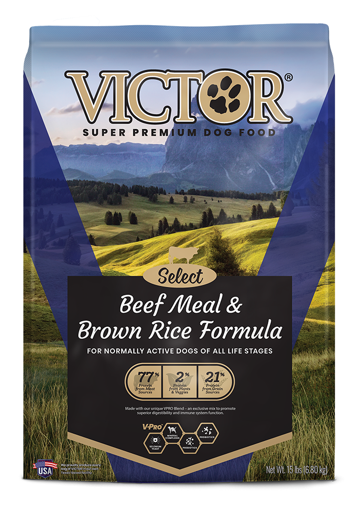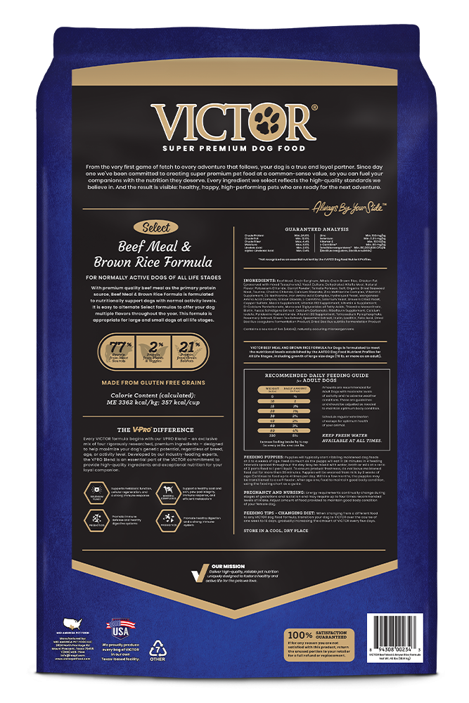 Shop / Dog Food / Victor Select Beef Meal & Brown Rice Formula Dry Dog Food Victor Select Beef Meal & Brown Rice Formula Dry Dog Food Victor Weight: 40 lb $52.99 40-lb Purchase Options Free In-Store Pick Up Not Available Save 10% on orders $49+ Set your store for inventory and store pickup details Zip Code Search Same-day Delivery* No minimum charge for delivery orders. *Order before 2pm and have it delivered today. Orders placed after 2pm will be delivered the next day. Must be inside delivery radius. Zip Code Unfortunately delivery is not available to this address. In order to ensure the best availability accuracy, changing your selected store will remove all items from your cart. You will need to re-add these items with your newly selected store if you choose to continue. Continue Cancel Ship it to Me Quantity Add To Cart Feeding guide disclaimer ✕ Feeding guides provide a starting point for the amount of food to give your pet each day. We recommend that you keep your pet in ideal body condition and not allow them to become overweight. The amount of food your pet needs can vary based on age, activity level or other food and treats given, so be sure to work with your veterinarian to determine an appropriate weight for your pet, and to make any necessary adjustments to their feeding. Information With premium-quality beef meal as the primary protein source, Beef Meal & Brown Rice Formula is formulated to nutritionally support dogs with normal activity levels. It is easy to alternate SELECT formulas to offer your dog multiple flavors throughout the year. This formula is appropriate for large and small dogs at all life stages. VICTOR Beef Meal & Brown Rice Formula for Dogs is formulated to meet the nutritional levels established by the AAFCO Dog Food Nutrient Profiles for All Life Stages, including growth of large size dogs (70 lb. or more as an adult)." "* All Life Stages formula with premium-quality beef meal as primary protein source. * Excellent for dogs with normal activity levels. * Fortified with vitamins, minerals, essential fatty acids, protein and amino acids. * Made with our unique VPRO Blend - an exclusive mix to promote superior digestibility and immune system function. * Ideal for dogs with allergies to other meat proteins." Ingredients Beef Meal, Grain Sorghum, Whole Grain Brown Rice, Chicken Fat (preserved with mixed Tocopherols), Yeast Culture, Dehydrated Alfalfa Meal, Natural Flavor, Potassium Chloride, Carrot Powder, Tomato Pomace, Salt, Organic Dried Seaweed Meal, Taurine, Choline Chloride, Calcium Stearate, Zinc Methionine Complex, Vitamin E Supplement, DL-Methionine, Iron Amino Acid Complex, Hydrolyzed Yeast, Manganese Amino Acid Complex, Silicon Dioxide, L-Carnitine, Selenium Yeast, Brewers Dried Yeast, Dried Enterococcus Faecium Fermentation Product, Dried Lactobacillus Acidophilus Fermentation Product, Dried Aspergillus Oryzae Fermentation Extract, Dried Trichoderma Longibrachiatum Fermentation Extract, Dried Bacillus Subtilis Fermentation Extract, Copper Sulfate, Niacin Supplement, Vitamin B12 Supplement, Vitamin A Supplement, D-Calcium Pantothenate, Thiamine Mononitrate, Biotin, Yucca Schidigera Extract, Calcium Carbonate, Riboflavin Supplement, Calcium Iodate, Pyridoxine Hydrochloride, Vitamin D3 Supplement, Tetrasodium Pyrophosphate, Vegetable Oil, Rosemary Extract, Green Tea Extract, Spearmint Extract, Inulin, Lecithin, Folic Acid Guaranteed Analysis Nutrient Guaranteed Units Crude Protein 24% min Crude Fat 12% min Crude Fiber 4.4% max Moisture 9.0% max Linoleic Acid 2% min Alpha Linolenic Acid (Omega 3) 0.4% min Zinc 150 mg/kg min Selenium 0.35 mg/kg min Vitamin E 150 IU/kg min L-Carnitine 80 mg/kg min Customers also liked Customer Reviews