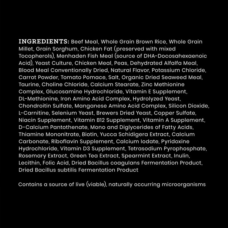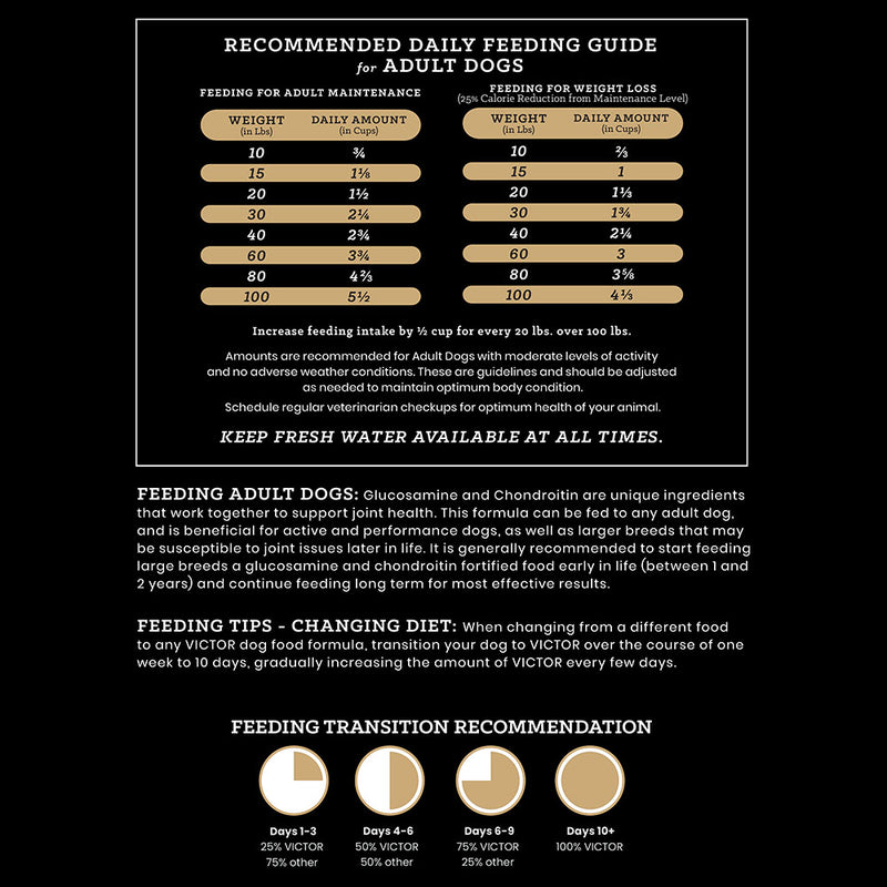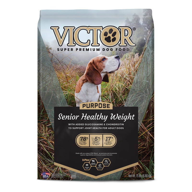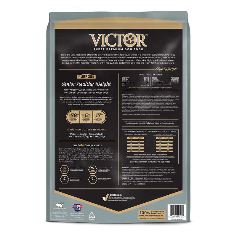 Shop / Unknown Type / Victor Senior/Healthy Weight Dry Dog Food Victor Senior/Healthy Weight Dry Dog Food Victor 15lb $31.99 15lb Purchase Options Free In-Store Pick Up Not Available Save 10% on orders $49+ Set your store for inventory and store pickup details Zip Code Search Same-day Delivery* No minimum charge for delivery orders. *Order before 2pm and have it delivered today. Orders placed after 2pm will be delivered the next day. Must be inside delivery radius. Zip Code Unfortunately delivery is not available to this address. In order to ensure the best availability accuracy, changing your selected store will remove all items from your cart. You will need to re-add these items with your newly selected store if you choose to continue. Continue Cancel Ship it to Me Quantity Add To Cart Feeding guide disclaimer ✕ Feeding guides provide a starting point for the amount of food to give your pet each day. We recommend that you keep your pet in ideal body condition and not allow them to become overweight. The amount of food your pet needs can vary based on age, activity level or other food and treats given, so be sure to work with your veterinarian to determine an appropriate weight for your pet, and to make any necessary adjustments to their feeding. Information VICTOR Senior Healthy Weight is an excellent choice for older dogs that are less active, and adult dogs that need to reduce overall weight. This multi-protein, nutrient-dense formula is specially formulated for breeds that are susceptible to joint issues.VICTOR Senior Healthy Weight for Dogs is formulated to meet the nutritional levels established by the AAFCO Dog Food Nutrient Profiles for Adult Maintenance. This nutrient-dense recipe is made with premium-quality beef, chicken and fish meals to provide sustained energy Ideal for older dogs that are less active, and adult dogs that need to reduce overall weight Glucosamine and Chondroitin promote long-term joint health Fortified with vitamins, minerals, essential fatty acids, protein and amino acids Made with our unique VPRO Blend - an exclusive mix to promote superior digestibility and immune system function Made from gluten free grains Ingredients Beef Meal, Whole Grain Brown Rice, Whole Grain Millet, Grain Sorghum, Chicken Fat (preserved with mixed Tocopherols), Menhaden Fish Meal (source of DHA-Docosahexaenoic Acid), Yeast Culture, Chicken Meal, Peas, Dehydrated Alfalfa Meal, Blood Meal Conventionally Dried, Natural Flavor, Potassium Chloride, Carrot Powder, Tomato Pomace, Salt, Organic Dried Seaweed Meal, Taurine, Choline Chloride, Calcium Stearate, Zinc Methionine Complex, Glucosamine Hydrochloride, Vitamin E Supplement, DL-Methionine, Iron Amino Acid Complex, Hydrolyzed Yeast, Chondroitin Sulfate, Manganese Amino Acid Complex, Silicon Dioxide, L-Carnitine, Selenium Yeast, Brewers Dried Yeast, Copper Sulfate, Niacin Supplement, Vitamin B12 Supplement, Vitamin A Supplement, D-Calcium Pantothenate, Mono and Diglycerides of Fatty Acids, Thiamine Mononitrate, Biotin, Yucca Schidigera Extract, Calcium Carbonate, Riboflavin Supplement, Calcium Iodate, Pyridoxine Hydrochloride, Vitamin D3 Supplement, Tetrasodium Pyrophosphate, Rosemary Extract, Green Tea Extract, Spearmint Extract, Inulin, Lecithin, Folic Acid, Dried Bacillus coagulans Fermentation Product, Dried Bacillus subtilis Fermentation Product Contains a source of live (viable), naturally occurring microorganisms Guaranteed Analysis Crude Protein (Min.) 27.0% Crude Fat (Min.) 11.5% Crude Fiber (Max.) 4.5% Moisture (Max.) 9.0% Linoleic Acid (Min.) 2.6% alpha-Linolenic Acid (Min.) 0.4% DHA (Min.) 0.10% Zinc (Min.) 150 mg/kg Selenium (Min.) 0.35 mg/kg Vitamin E (Min.) 150 IU/kg L-Carnitine* (Min.) 100 mg/kg Glucosamine* (Min.) 800 mg/kg Chondroitin Sulfate* (Min.) 300 mg/kg Total Microorganisms* (Min) 80,000,000 CFU/lb (Bacillus coagulans, Bacillus subtilis) Customers also liked Customer Reviews