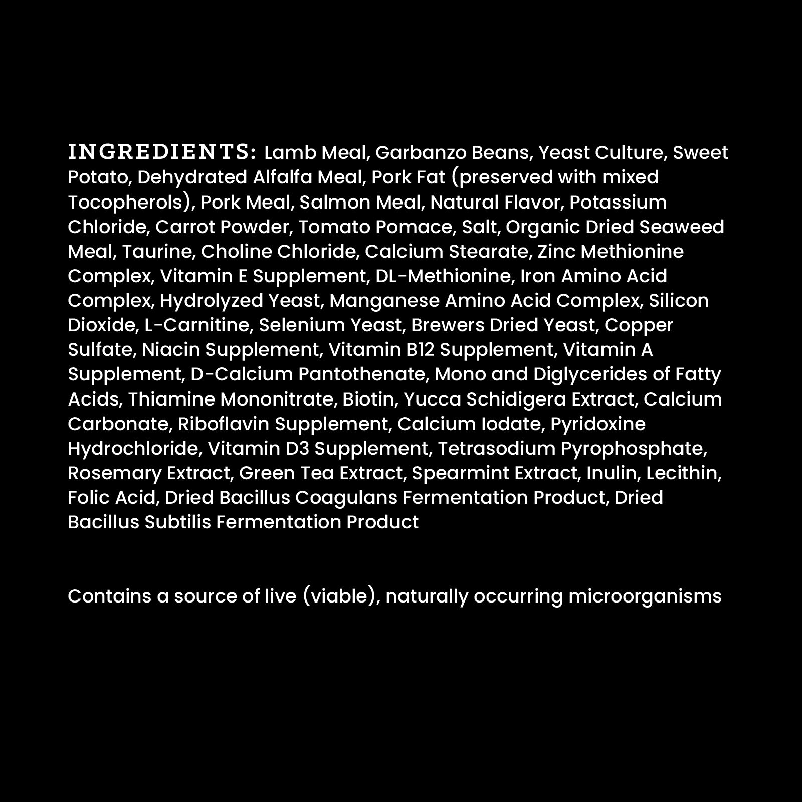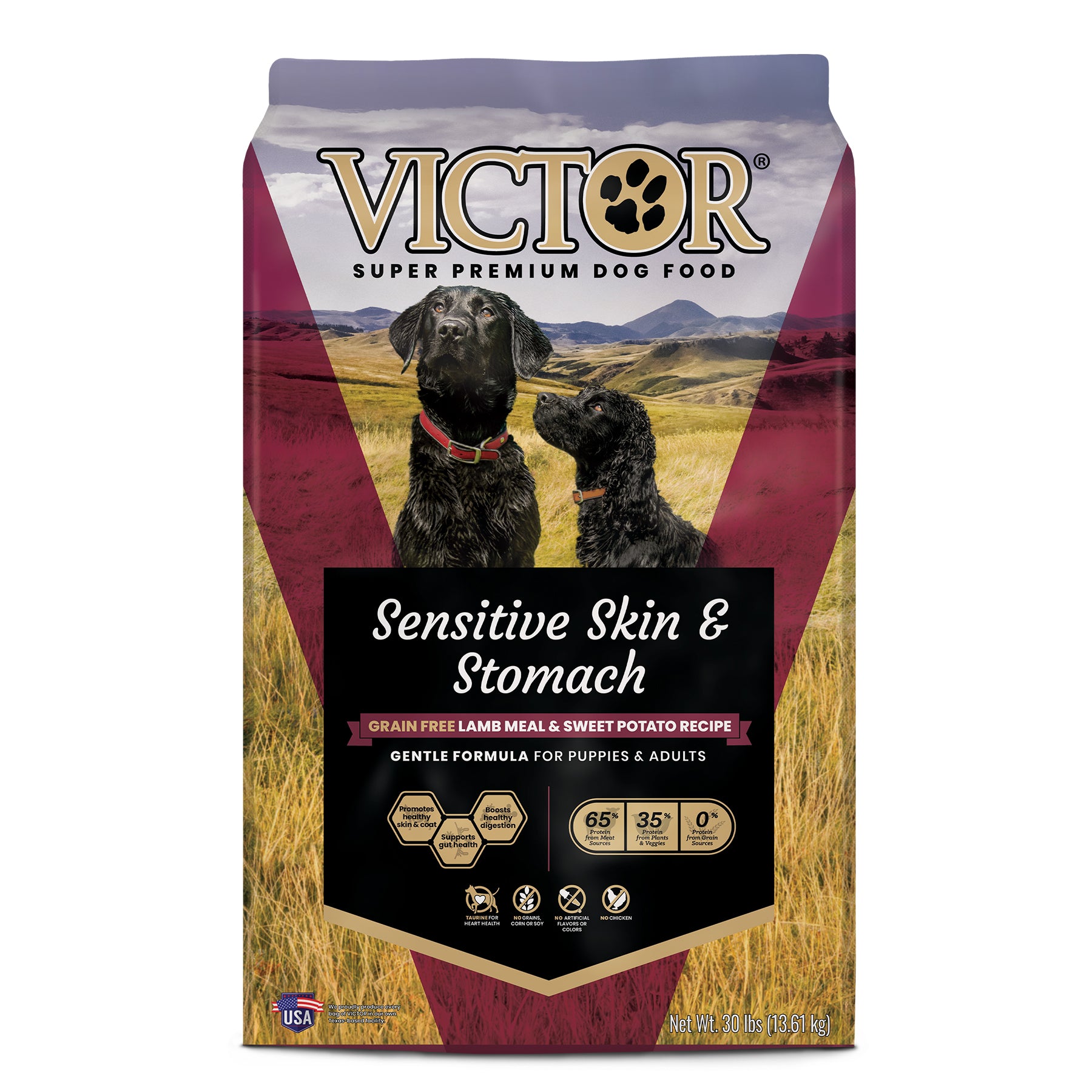 Shop / Unknown Type / VICTOR Sensitive Skin and Stomach Grain Free Lamb Meal and Sweet Potato Recipe 30lb VICTOR Sensitive Skin and Stomach Grain Free Lamb Meal and Sweet Potato Recipe 30lb Victor 30lb $66.99 $4 offDiscount will apply in cart $4 OffDiscount will apply in cart 30lb Purchase Options Free In-Store Pick Up Not Available Save 20% on orders $100+ Set your store for inventory and store pickup details Zip Code Search Same-day Delivery* No minimum charge for delivery orders. *Order before 2pm and have it delivered today. Orders placed after 2pm will be delivered the next day. Must be inside delivery radius. Zip Code Unfortunately delivery is not available to this address. In order to ensure the best availability accuracy, changing your selected store will remove all items from your cart. You will need to re-add these items with your newly selected store if you choose to continue. Continue Cancel Ship it to Me Quantity Add To Cart Feeding guide disclaimer ✕ Feeding guides provide a starting point for the amount of food to give your pet each day. We recommend that you keep your pet in ideal body condition and not allow them to become overweight. The amount of food your pet needs can vary based on age, activity level or other food and treats given, so be sure to work with your veterinarian to determine an appropriate weight for your pet, and to make any necessary adjustments to their feeding. Information VICTOR's Sensitive Skin and Stomach Grain Free Lamb Meal & Sweet Potato Recipe is ideal for dogs with sensitivities or allergies. This digestible formula is gentle on the stomach and formulated without common allergens like gluten, chicken, corn, or soy. With omega 3 and 6, plus Vitamin E, this recipe supports a healthy coat and skin.åÊ Like all VICTOR products, the majority of the protein in this recipe comes from high-quality meat sources. Specifically, 65% of the protein comes from lamb, pork and salmon meals. The protein to fat ratio for this formula is: 25% protein and 14% fat. This recipe is appropriate for dogs of all life stages - puppy through adulthood. VICTOR Sensitive Skin and Stomach Grain Free Lamb Meal & Sweet Potato Recipe for Dogs is formulated to meet the nutritional levels established by the AAFCO Dog Food Nutrient Profiles for All Life Stages, except for growth of large size dogs (70 lb. or more as an adult). Formula claims include: > Promotes healthy skin & coat> Supports gut health> Boosts healthy digestion> Taurine for heart health> No grains, corn or soy> No artificial flavors or colors> No chicken> No peas or pea protein Ingredients Lamb Meal, Garbanzo Beans, Yeast Culture, Sweet Potato, Dehydrated Alfalfa Meal, Pork Fat (preserved with mixed Tocopherols), Pork Meal, Salmon Meal, Natural Flavor, Potassium Chloride, Carrot Powder, Tomato Pomace, Salt, Organic Dried Seaweed Meal, Taurine, Choline Chloride, Calcium Stearate, Zinc Methionine Complex, Vitamin E Supplement, DL-Methionine, Iron Amino Acid Complex, Hydrolyzed Yeast, Manganese Amino Acid Complex, Silicon Dioxide, L-Carnitine, Selenium Yeast, Brewers Dried Yeast, Copper Sulfate, Niacin Supplement, Vitamin B12 Supplement, Vitamin A Supplement, D-Calcium Pantothenate, Mono and Diglycerides of Fatty Acids, Thiamine Mononitrate, Biotin, Yucca Schidigera Extract, Calcium Carbonate, Riboflavin Supplement, Calcium Iodate, Pyridoxine Hydrochloride, Vitamin D3 Supplement, Tetrasodium Pyrophosphate, Rosemary Extract, Green Tea Extract, Spearmint Extract, Inulin, Lecithin, Folic Acid, Dried Bacillus Coagulans Fermentation Product, Dried Bacillus Subtilis Fermentation Product Guaranteed Analysis Crude Protein (Min.) 25.0% Crude Fat (Min.) 14.0% Crude Fiber (Max.) 6.0% Moisture (Max.) 10.0% Zinc (Min.) 150 mg/kg Selenium (Min.) 0.40 mg/kg Biotin* (Min.) 0.10 mg/kg (Vitamin E (Min.) 150 IU/kg Taurine*(Min.) 0.1% (Min) Omega-6 Fatty Acids* (Min.) 2.2% Omega-3 Fatty Acids* (Min) 0.4% Total Microorganisms* 80,000,000 CFU/lb (Bacillus coagulans, Bacillus subtilis) *Not recognized as an essential nutrient by the AAFCO Dog Food Nutrient Profiles. Customers also liked Customer Reviews