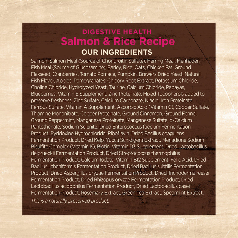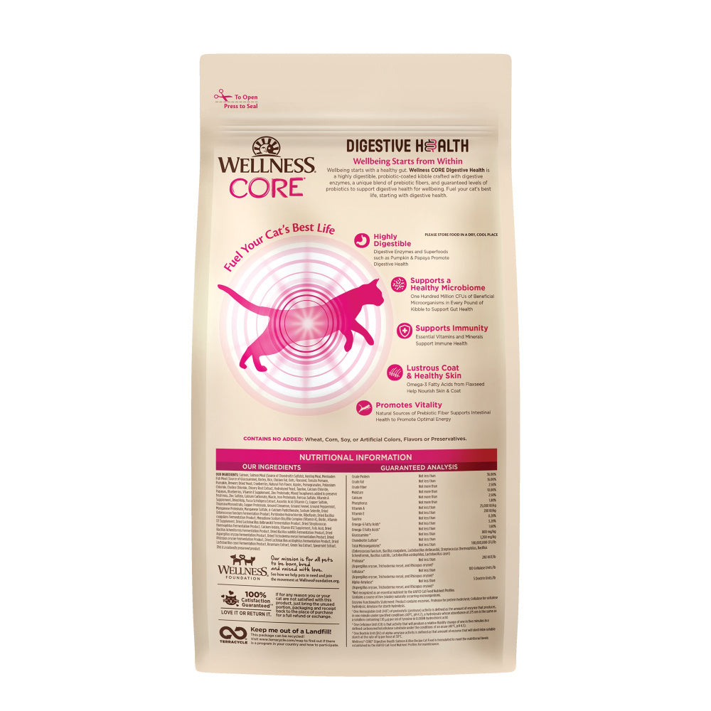 Shop / Cat Food / Wellness Core Digestive Health Salmon Recipe Dry Cat Food Wellness Core Digestive Health Salmon Recipe Dry Cat Food Wellness $26.99 5 lb 11 lb 5-lb 11-lb Purchase Options Free In-Store Pick Up Not Available Save 10% on orders $49+ Set your store for inventory and store pickup details Zip Code Search Same-day Delivery* No minimum charge for delivery orders. *Order before 2pm and have it delivered today. Orders placed after 2pm will be delivered the next day. Must be inside delivery radius. Zip Code Unfortunately delivery is not available to this address. In order to ensure the best availability accuracy, changing your selected store will remove all items from your cart. You will need to re-add these items with your newly selected store if you choose to continue. Continue Cancel Ship it to Me Quantity Add To Cart Feeding guide disclaimer ✕ Feeding guides provide a starting point for the amount of food to give your pet each day. We recommend that you keep your pet in ideal body condition and not allow them to become overweight. The amount of food your pet needs can vary based on age, activity level or other food and treats given, so be sure to work with your veterinarian to determine an appropriate weight for your pet, and to make any necessary adjustments to their feeding. Information Did you know that your cats wellbeing starts with a healthy gut? Wellness® CORE® Digestive Health is a highly digestible, probiotic-coated kibble crafted with digestive enzymes, a unique blend of prebiotic fibers, and guaranteed levels of probiotics to support digestive health for wellbeing. Fuel your cats best life, starting with digestive health. From their immune system to energy levels and even their skin and coat, it all starts with digestive health.Why We Love It: Digestive Health Cat Food: This highly digestible, probiotic coated dry cat food is made with digestive enzymes, a blend of prebiotic fibers, and guaranteed levels of probiotics to support gut health for overall wellbeing Made in the USA About WellnessWhat our pets eat feeds the soul and protects the body. That's why Wellness takes carefully selected, authentic ingredients from trusted sources to create an ideal nutritional balance with lean, healthy proteins, probiotics, omega fatty acids, fresh fruits and veggie antioxidants, and vitamins and nutrients. With over 200 varieties of foods with high quality proteins like salmon, beef, rabbit, and duck, in grain-free limited ingredient, dry and wet formulas, Wellness can offer every dog and cat something special and perfect just for them. Using only whole foods, with no wheat, corn, soy, preservatives, artificial colors and flavors, or empty calories, Wellness is the face of a new generation in pet food. Ingredients Salmon, Salmon Meal (Source of Chondroitin Sulfate), Herring Meal, Menhaden Fish Meal (Source of Glucosamine), Barley, Rice, Chicken Fat, Oats, Flaxseed, Tomato Pomace, Pumpkin, Brewers Dried Yeast, Cranberries, Natural Fish Flavor, Apples, Pomegranates, Potassium Chloride, Choline Chloride, Chicory Root Extract, Hydrolyzed Yeast, Taurine, Calcium Chloride, Papayas, Blueberries, Vitamin E Supplement, Zinc Proteinate, Mixed Tocopherols added to preserve freshness, Zinc Sulfate, Calcium Carbonate, Niacin, Iron Proteinate, Ferrous Sulfate, Vitamin A Supplement, Dried Kelp, Yucca Schidigera Extract, Ascorbic Acid (Vitamin C), Copper Sulfate, Thiamine Mononitrate, Copper Proteinate, Ground Cinnamon, Ground Fennel, Ground Peppermint, Manganese Proteinate, Manganese Sulfate, d-Calcium Pantothenate, Sodium Selenite, Dried Enterococcus faecium Fermentation Product, Pyridoxine Hydrochloride, Riboflavin, Dried Bacillus coagulans Fermentation Product, Menadione Sodium Bisulfite Complex (Vitamin K), Biotin, Vitamin D3 Supplement, Dried Lactobacillus delbrueckii Fermentation Product, Dried Streptococcus thermophilus Fermentation Product, Calcium Iodate, Vitamin B12 Supplement, Folic Acid, Dried Bacillus licheniformis Fermentation Product, Dried Bacillus subtilis Fermentation Product, Dried Aspergillus oryzae Fermentation Product, Dried Trichoderma reesei Fermentation Product, Dried Rhizopus oryzae Fermentation Product, Dried Lactobacillus acidophilus Fermentation Product, Dried Lactobacillus casei Fermentation Product, Rosemary Extract, Green Tea Extract, Spearmint Extract. Guaranteed Analysis Nutrient Guaranteed Units Crude Protein 38% min Crude Fat 10% min Crude Fiber 6% max Moisture 10% max Customers also liked Customer Reviews