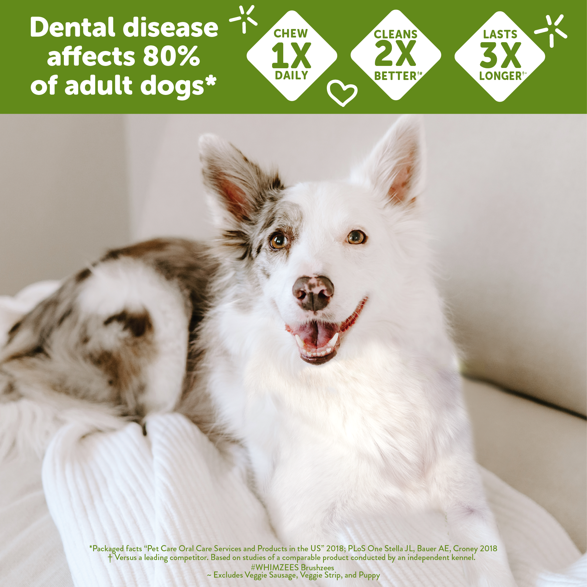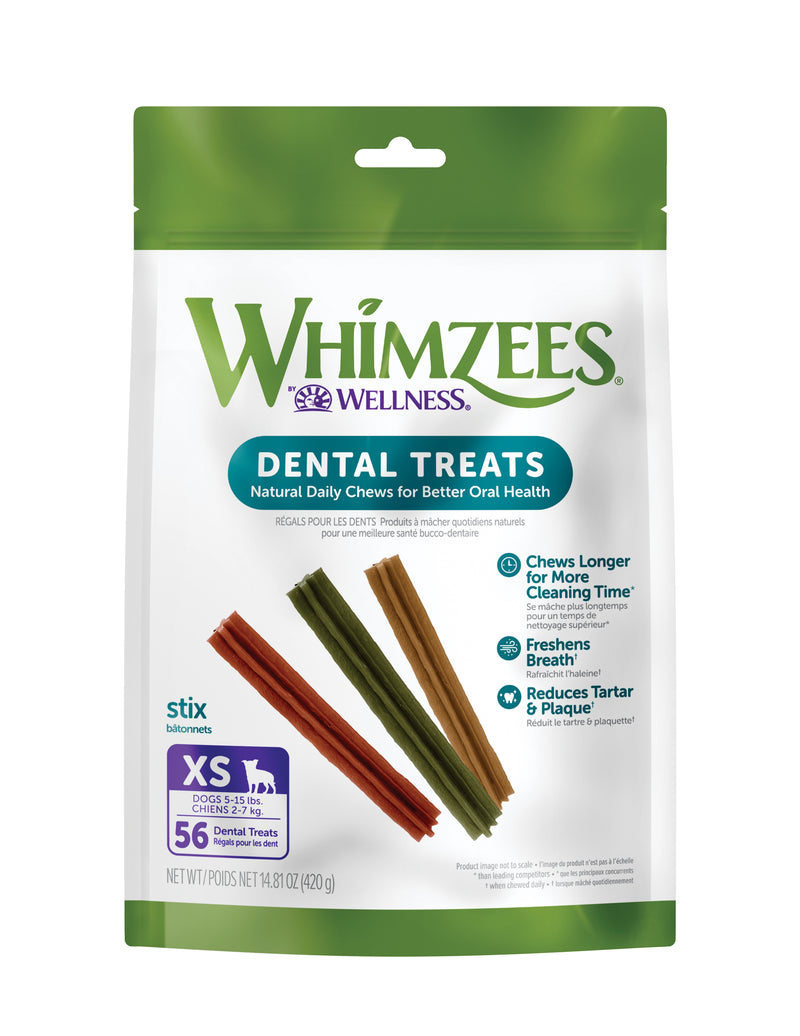 Shop / Unknown Type / WHIMZEES by Wellness Stix Natural Grain Free Dental Chews for Dogs, Extra Small Breed, 56 count WHIMZEES by Wellness Stix Natural Grain Free Dental Chews for Dogs, Extra Small Breed, 56 count Wellness Extra Small $19.99 Extra Small Purchase Options Free In-Store Pick Up Not Available Save 10% on orders $49+ Set your store for inventory and store pickup details Zip Code Search Same-day Delivery* No minimum charge for delivery orders. *Order before 2pm and have it delivered today. Orders placed after 2pm will be delivered the next day. Must be inside delivery radius. Zip Code Unfortunately delivery is not available to this address. In order to ensure the best availability accuracy, changing your selected store will remove all items from your cart. You will need to re-add these items with your newly selected store if you choose to continue. Continue Cancel Ship it to Me Quantity Add To Cart Feeding guide disclaimer ✕ Feeding guides provide a starting point for the amount of food to give your pet each day. We recommend that you keep your pet in ideal body condition and not allow them to become overweight. The amount of food your pet needs can vary based on age, activity level or other food and treats given, so be sure to work with your veterinarian to determine an appropriate weight for your pet, and to make any necessary adjustments to their feeding. Information Give your dog one WHIMZEES® per day and you're giving them a fun, all natural way to help clean teeth, freshen breath, and reduce plaque and tartar - all while they chew! Dental disease is the number one health issue for dogs, affecting 80% of adult dogs and 96% of senior dogs. That's why we believe it's more important than ever to take an active role in your pup's at-home dental care. What separates WHIMZEES® from the pack? Designed by our tem of pet health experts, WHIMZEES® are scientifically proven to help control plaque and tartar, improve breath odor, and decrease gingivitis. Our treats clean two times better than a leading competitor*, and deliver three times longer chew time*#. A longer chew time means a longer cleaning time - all to support your dog's dental health. You brush daily, your dog should too! *Based on studies of comparable products conducted by an independent kennel. Excludes Veggie Sausage, Veggie Strip, and Puppy varieties. Ingredients Potato Starch, Glycerin, Powdered Cellulose, Lecithin, Yeast, Malt Extract, Lupine, Alfalfa Extract, Paprika Guaranteed Analysis Crude Protein 1.1% minCrude Fat 2.0% min Crude Fat 4.3% maxCrude Fiber 13.7% maxCrude Ash 2.4% maxMoisture 12.0% max Guaranteed Analysis Crude Protein 1.1% minCrude Fat 2.0% min Crude Fat 4.3% maxCrude Fiber 13.7% maxCrude Ash 2.4% maxMoisture 12.0% max Customers also liked Customer Reviews