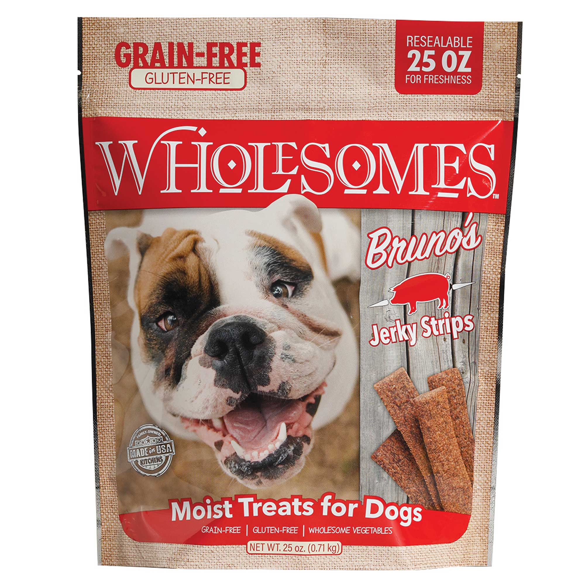 Shop / Unknown Type / Wholesomes Bruno's Jerky Strips Grain-Free Dog Treats Wholesomes Bruno's Jerky Strips Grain-Free Dog Treats Wholesomes 25oz $11.99 Save $1Discount will apply in cart 25oz Purchase Options Free In-Store Pick Up Not Available Save 10% on orders $49+ Set your store for inventory and store pickup details Zip Code Search Same-day Delivery* No minimum charge for delivery orders. *Order before 2pm and have it delivered today. Orders placed after 2pm will be delivered the next day. Must be inside delivery radius. Zip Code Unfortunately delivery is not available to this address. In order to ensure the best availability accuracy, changing your selected store will remove all items from your cart. You will need to re-add these items with your newly selected store if you choose to continue. Continue Cancel Ship it to Me Quantity Add To Cart Feeding guide disclaimer ✕ Feeding guides provide a starting point for the amount of food to give your pet each day. We recommend that you keep your pet in ideal body condition and not allow them to become overweight. The amount of food your pet needs can vary based on age, activity level or other food and treats given, so be sure to work with your veterinarian to determine an appropriate weight for your pet, and to make any necessary adjustments to their feeding. Information Bring the taste of the BBQ shack straight to your home with Wholesomes Bruno's Jerky Strips Grain-Free Dog Treats. USA-raised pork provides a delicious source of protein that is designed to supply your pooch with the energy he needs for long walks and trips to the dog park. Farm-grown veggies are rich in fiber and nutrients so your canine companion’s muscles grow strong and lean. This tasty recipe is made in family-owned, USA kitchens and is free of both gluten and grain! With their tender consistency and smoky aroma, these jerky strips will paw-sitively be your furry friend’s new favorite snack. Ingredients Pork Meal, Peas, Pea Starch, Water, Coconut Glycerin, Dried Eggs, Pea Protein, Chickpeas, Chicken Fat (Preserved with Mixed Tocopherols), Gelatin, Butternut Squash, Phosphoric Acid, Natural Flavors, Salt, Natural Smoke Flavor, Potassium Sorbate (Preservative). Guaranteed Analysis Crude Protein (min) 24%, Crude Fat (min) 8%, Crude Fiber (max) 3.0%, Moisture (max) 24% Customers also liked Customer Reviews