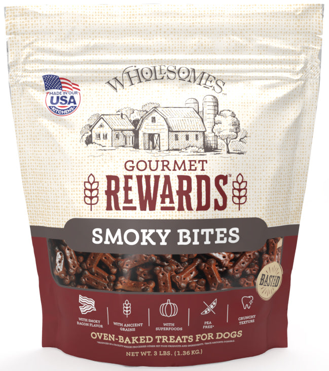 Shop / Unknown Type / Wholesomes Gourmet Rewards Smoky Bites Biscuit Dog Treats Wholesomes Gourmet Rewards Smoky Bites Biscuit Dog Treats Wholesomes 3lb $6.99 Save $1Discount will apply in cart 3lb Purchase Options Free In-Store Pick Up Not Available Save 10% on orders $49+ Set your store for inventory and store pickup details Zip Code Search Same-day Delivery* No minimum charge for delivery orders. *Order before 2pm and have it delivered today. Orders placed after 2pm will be delivered the next day. Must be inside delivery radius. Zip Code Unfortunately delivery is not available to this address. In order to ensure the best availability accuracy, changing your selected store will remove all items from your cart. You will need to re-add these items with your newly selected store if you choose to continue. Continue Cancel Ship it to Me Quantity Add To Cart Feeding guide disclaimer ✕ Feeding guides provide a starting point for the amount of food to give your pet each day. We recommend that you keep your pet in ideal body condition and not allow them to become overweight. The amount of food your pet needs can vary based on age, activity level or other food and treats given, so be sure to work with your veterinarian to determine an appropriate weight for your pet, and to make any necessary adjustments to their feeding. Information Wholesomes Smoky Bites Bacon Flavor Dog Treats are a great way to reward your pup while providing a delicious supplement to his diet. These treats are made in family-owned, USA kitchens with a smoky, bacon flavor dogs love and have a crunchy texture that helps remove plaque and tartar to support healthy gums. And you’ll be happy to know that every biscuit is naturally preserved and contains nutrient-rich ingredients such as oatmeal, pumpkin, sweet potato and butternut squash for an added boost of benefits! Ingredients Wheat, Chicken Meal, Oatmeal, Dried Bacon Fat, Pumpkin, Sweet Potato, Oat Fiber, Chicken Fat (Preserved with Mixed Tocopherols), Butternut Squash, Natural Flavor, Hickory Smoke Flavor, Rosemary Extract. Guaranteed Analysis Crude Protein (min) 16%, Crude Fat (min) 7%, Crude Fiber (max) 4.0%, Moisture (max) 10% Customers also liked Customer Reviews