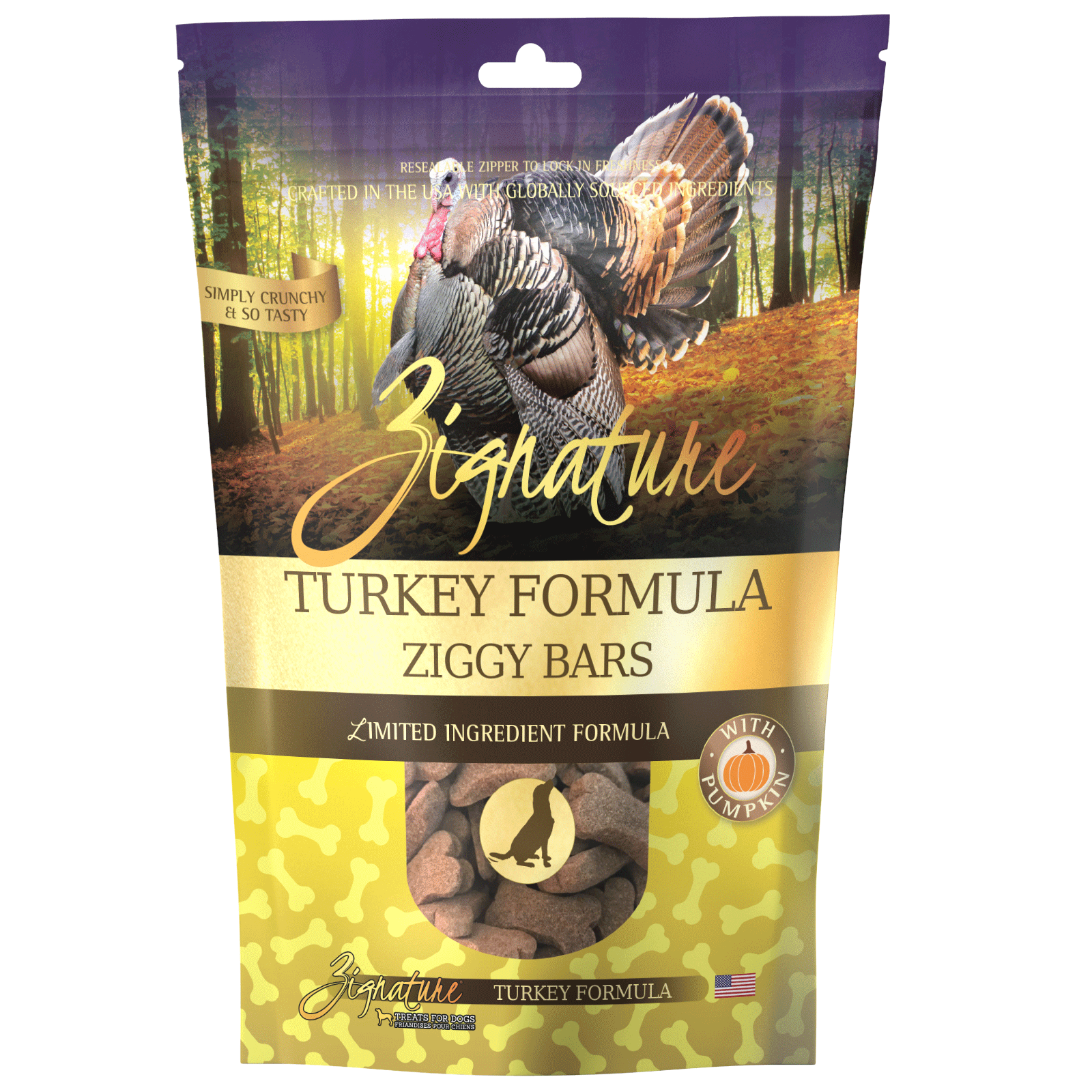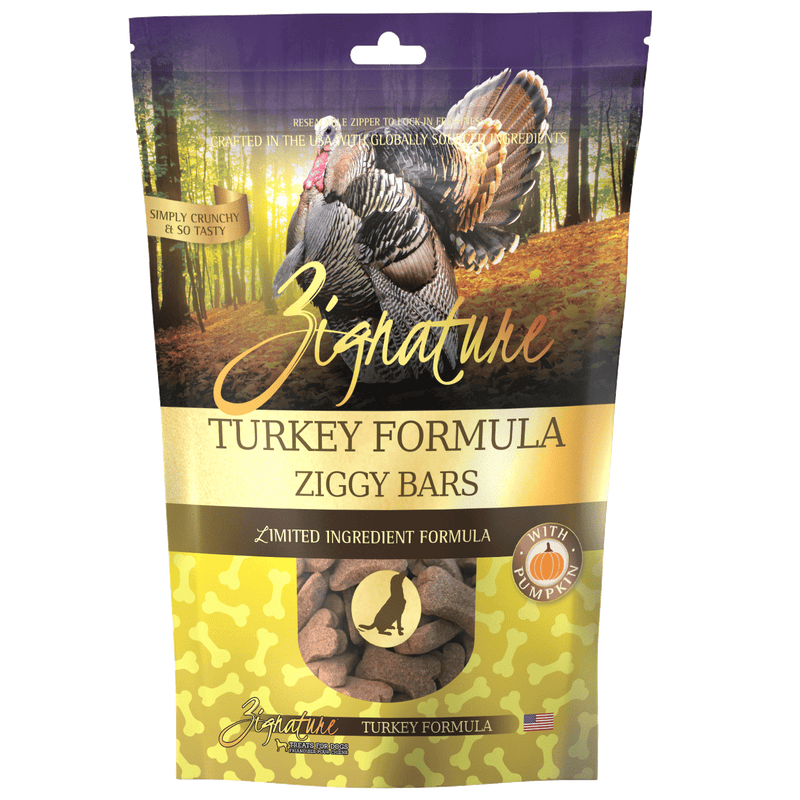 Shop / Unknown Type / Zignature Turkey Biscuit Treat For Dog, 12oz Zignature Turkey Biscuit Treat For Dog, 12oz Zignature 12oz $8.99 12oz Purchase Options Free In-Store Pick Up Not Available Save 10% on orders $49+ Set your store for inventory and store pickup details Zip Code Search Same-day Delivery* No minimum charge for delivery orders. *Order before 2pm and have it delivered today. Orders placed after 2pm will be delivered the next day. Must be inside delivery radius. Zip Code Unfortunately delivery is not available to this address. In order to ensure the best availability accuracy, changing your selected store will remove all items from your cart. You will need to re-add these items with your newly selected store if you choose to continue. Continue Cancel Ship it to Me Quantity Add To Cart Feeding guide disclaimer ✕ Feeding guides provide a starting point for the amount of food to give your pet each day. We recommend that you keep your pet in ideal body condition and not allow them to become overweight. The amount of food your pet needs can vary based on age, activity level or other food and treats given, so be sure to work with your veterinarian to determine an appropriate weight for your pet, and to make any necessary adjustments to their feeding. Information Zignature Turkey Ziggy Bars make training time more fun! These tasty treats are formulated with the same limited ingredient philosophy as our dry and canned foods and include healthy, wholesome ingredients like pumpkin to make treat time much more enjoyable for you and your furry friend! Ingredients Ingredients: Turkey, Peas, Chickpeas, Pea Flour, Pumpkin, Natural Flavor, Mixed Tocopherols (a natural preservative), Rosemary Extract. Guaranteed Analysis Guaranteed Analysis: CRUDE PROTEIN (MIN)24%CRUDE FAT (MIN)7%CRUDE FIBER (MAX)5%MOISTURE (MAX)10%3300 Kcal/Kg20 Kcal/Treat Customers also liked Customer Reviews