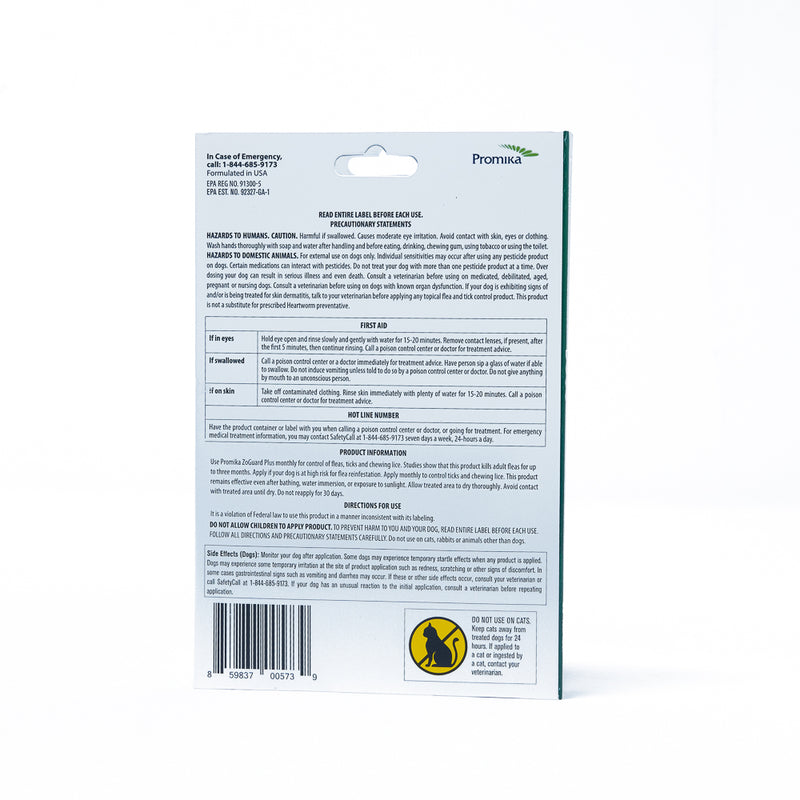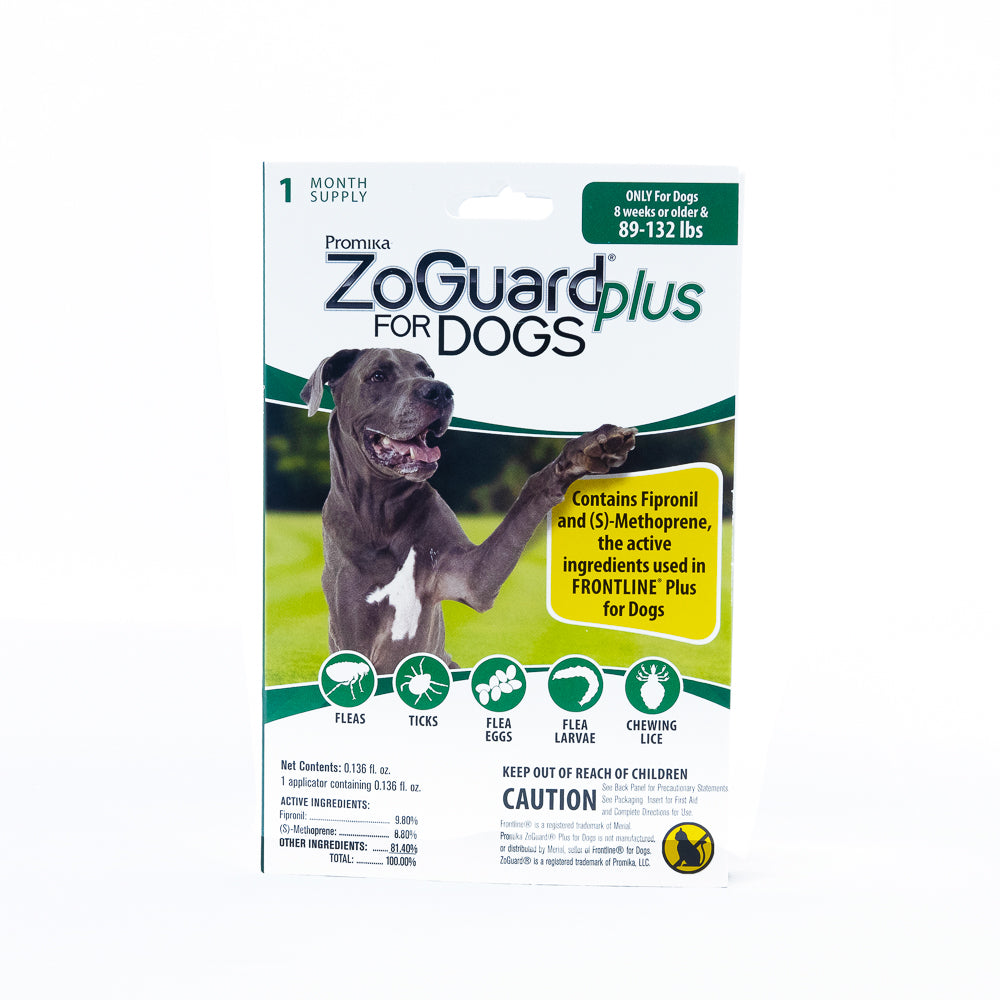 Shop / Unknown Type / ZoGuard Plus for Dogs 89-132lb 1 Pack ZoGuard Plus for Dogs 89-132lb 1 Pack ZoGuard 1 pack $11.99 1 pack Purchase Options Free In-Store Pick Up Not Available Save 10% on orders $49+ Set your store for inventory and store pickup details Zip Code Search Same-day Delivery* No minimum charge for delivery orders. *Order before 2pm and have it delivered today. Orders placed after 2pm will be delivered the next day. Must be inside delivery radius. Zip Code Unfortunately delivery is not available to this address. In order to ensure the best availability accuracy, changing your selected store will remove all items from your cart. You will need to re-add these items with your newly selected store if you choose to continue. Continue Cancel Ship it to Me Quantity Add To Cart Information ZoGuard Plus for Dogs, comparable to Frontline Plus contains the same active ingredients and offers the same level of flea and tick protection at a better value. ZoGuard Plus for Dogs is effective against all life stages of the flea, effectively breaking the life cycle and controlling re-infestations. Each package includes a monthly doses providing 12 weeks of protection. ZoGuard Plus for Dogs is waterproof and will remain effective even after bathing, water immersion, or exposure to sunlight. Ingredients: fipronil.. 9.8%, S-Methropene.. 11.80%, Other ingredients 78.40% Customers also liked Customer Reviews